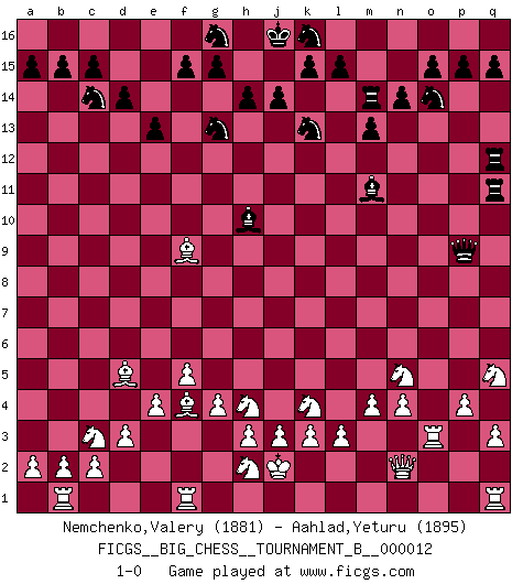 Last move : 1-0 2019 August 17 18:14:10 [Event "FICGS__BIG_CHESS__TOURNAMENT_B__000012"] [Site "FICGS"] [Date "2019.06.22"] [Round "1"] [White "Nemchenko,Valery"] [Black "Aahlad,Yeturu"] [Result "1-0"] [WhiteElo "1881"] [BlackElo "1895"] 1.g2-g4 j15-k13 2.j2-k4 h16-o10 3.g1-f3 o10-o2 4.p1-o3 o2-k6 5.f3-h4 b16-c14 6.b1-c3 e15-e13 7.k4-h5 k6-l7 8.k1-l3 f16-c13 9.m2-m4 m15-m13 10.n2-n4 h15-g13 11.o1-m3 d15-d14 12.f1-g2 l16-o13 13.d2-d3 c16-p4 14.q2-q3 p4-q5 15.c1-d2 e16-e14 16.l3-m5 l7-f7 17.e1-f1 n15-n14 18.f2-f4 o16-h10 19.g2-d5 f7-e8 20.e2-e4 m16-m14 21.l1-o4 c13-g9 22.l2-l3 m14-l14 23.o4-h10 g9-h10 24.f4-f5 l14-l11 25.m3-l2 e14-f14 26.h5-k4 e8-b8 27.a1-b1 f14-f12 28.j1-j2 a16-e16 29.d2-f4 b8-p8 30.p2-p4 q5-o7 31.k2-k3 p16-o14 32.o3-n5 o7-j12 33.m1-o1 q16-m16 34.l2-m3 j12-f9 35.o1-o2 f12-q12 36.m3-f9 l11-q11 37.m5-o4 e16-e14 38.f9-l4 p8-p9 39.o2-o3 e14-f14 40.o4-q5 m16-m14 41.h1-o1 o13-m11 42.o1-n2 f14-f9 43.l4-f9 1-0 Follow this game move after move (download)A good sacrifice is one that is not necessarily sound but leaves your opponent dazed and confused. (Rudolph Spielmann) Im Internet Chess Club betrug mein Rating vorübergehend 3350 ELO-Punkte. (Sergej Karjakin) Para mi, el Ajedrez es la vida y cada partida es como una nueva vida. Todo jugador de Ajedrez suele vivir muchas vidas durante su vida. (Eduard Gufeld) Avec des compensations pour le matériel en plus... (Anonyme) To be champion requires more than simply being a strong player; one has to be a strong human being as well. (Anatoly Karpov)