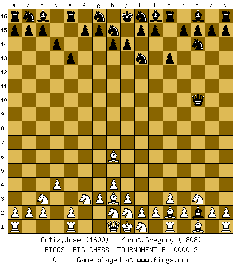 Last move : 0-1 2019 August 4 23:10:25 [Event "FICGS__BIG_CHESS__TOURNAMENT_B__000012"] [Site "FICGS"] [Date "2019.06.22"] [Round "1"] [White "Ortiz,Jose"] [Black "Kohut,Gregory"] [Result "0-1"] [WhiteElo "1600"] [BlackElo "1808"] 1.b1-c3 j15-k13 2.d2-d4 h16-o10 3.p1-o3 o10-f2 4.g1-f3 f2-o10 5.h3-h4 m15-m13 6.g2-g3 e15-e13 7.f1-h3 p16-o14 8.c1-h6 f16-c13 9.m2-m3 d15-d14 10.l1-m2 c13-o2 0-1 This big chess game has been lost on time (started : 2019.06.22 19:41:34) Follow this game move after move (download)A man that will take back a move at Chess will pick a pocket. (Richard Fenton) Wenn ich Weiß habe gewinne ich weil ich Weiß habe, wenn ich Schwarz habe gewinne ich weil ich Bogoljubov bin. (Efim Bogoljubov) En el tablero, la mentira e hipocresía no sobreviven mucho. (Emanuel Lasker) Que feriez-vous si vous étiez en train de jouer aux échecs et que la fin du monde arrive ? Je continuerais à jouer. (Saint Borromée) Follow your passion, and success will follow you. (Arthur Buddhold)