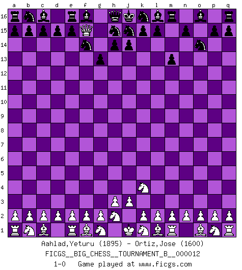 Last move : 1-0 2019 August 5 23:58:13 [Event "FICGS__BIG_CHESS__TOURNAMENT_B__000012"] [Site "FICGS"] [Date "2019.06.22"] [Round "1"] [White "Aahlad,Yeturu"] [Black "Ortiz,Jose"] [Result "1-0"] [WhiteElo "1895"] [BlackElo "1600"] 1.j2-k4 g15-g13 2.h1-o7 g16-f14 3.o7-o15 p16-o14 4.o15-k11 m15-m13 5.k11-f15 1-0 This big chess game has been lost on time (started : 2019.06.22 19:41:34) Follow this game move after move (download)Avoid the crowd. Do your own thinking independently. Be the Chess player, not the Chess piece. (Ralph Charell) Kein Großmeister ist normal. Sie unterscheiden sich nur im Ausmaß Ihrer Verrücktheit. (Viktor Kortschnoi) Tu sabes, camarada Pachman, no disfruto el ser un Ministro, preferería jugar al Ajedrez como tu. (Che Guevara) Aux échecs, les retours au sommet sont rares : les dommages psychologiques consécutifs à une défaite sont trop sévères. (Daily Telegraph) They say in chess you've got to kill the queen, and then you mate it... Oh I, do you ? (Red Hot Chili Peppers, Fortune faded)