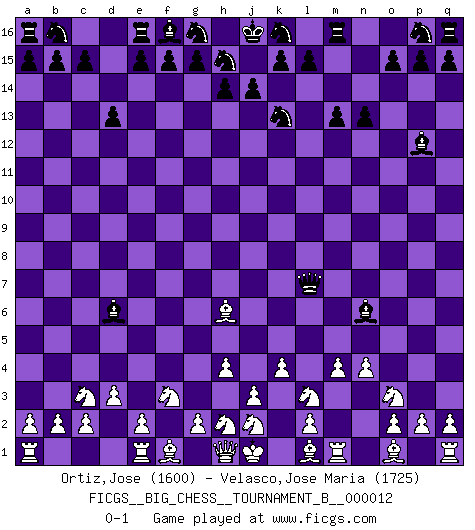 Last move : 0-1 2019 August 3 13:32:45 [Event "FICGS__BIG_CHESS__TOURNAMENT_B__000012"] [Site "FICGS"] [Date "2019.06.22"] [Round "1"] [White "Ortiz,Jose"] [Black "Velasco,Jose Maria"] [Result "0-1"] [WhiteElo "1600"] [BlackElo "1725"] 1.k2-k4 j15-k13 2.b1-c3 h16-o10 3.p1-o3 o10-f2 4.g1-f3 f2-l7 5.k1-l3 d15-d13 6.h3-h4 c16-n6 7.m2-m4 m15-m13 8.d2-d3 l16-p12 9.c1-h6 n15-n13 10.n2-n4 o16-d6 0-1 This big chess game has been lost on time (started : 2019.06.22 19:41:34) Follow this game move after move (download)Fischer is an American Chess tragedy on par with Morphy and Pillsbury. (Mig Greengard) Fischer machte Schach einfach zu einer aufregenden Sache, wann immer er sich ans Brett setzte. (Raymond Keene) Uno no tiene que jugar muy bien, es suficiente jugar mejor que el oponente. (Siegbert Tarrasch) Les Echecs sont affaire de jugement sensible. Savoir quand frapper et quand esquiver. (Fischer) Tree pose grows confidence. It roots me to this world. (Terri Guillemets)