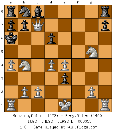 Last move : 1-0 2007 September 13 8:35:15 [Event "FICGS__CHESS__CLASS_E__000053"] [Site "FICGS"] [Date "2007.06.15"] [Round "1"] [White "Menzies,Colin"] [Black "Berg,Allen"] [Result "1-0"] [WhiteElo "1422"] [BlackElo "1400"] 1.e4 e5 2.f4 exf4 3.Bc4 Nf6 4.Nc3 d6 5.d4 g5 6.h4 Ng4 7.hxg5 Qxg5 8.Nf3 Ne3 9.Bxf7+ Kxf7 10.Nxg5+ Ke8 11.Bxe3 fxe3 12.Qh5+ Ke7 13.Nd5+ Kd7 14.Qf7+ Be7 15.Qxe7+ Kc6 16.Qxc7+ Kb5 17.a4+ Ka6 18.Nb4+ 1-0 KGA : Bishop's gambit, Bogolyubov variation Player White won this chess game. Follow this game move after move (download)I play correspondence chess because it is both art and science while chess is art only. (A player at FICGS) Ich spiele 70 Eröffnungssysteme. (Viktor Kortschnoi) Fischer no está bajo la obligación de nadie. (Joseph Platz) Même si l'adversaire joue le coup analysé précédemment, recommencez l'analyse en voyant la nouvelle position. Première règle de Blumenfeld The beginning of wisdom is silence. The second step is listening. (Unknown)