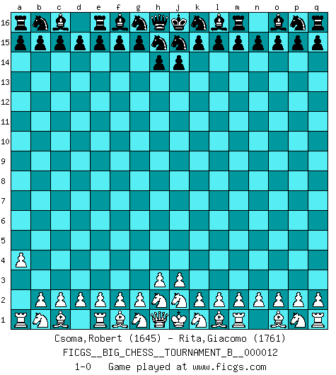 Last move : 1-0 2019 June 23 19:52:48 [Event "FICGS__BIG_CHESS__TOURNAMENT_B__000012"] [Site "FICGS"] [Date "2019.06.22"] [Round "1"] [White "Csoma,Robert"] [Black "Rita,Giacomo"] [Result "1-0"] [WhiteElo "1645"] [BlackElo "1761"] 1.a2-a4 1-0 Follow this game move after move (download)One bad move nullifies forty good ones. (Horowitz) Frage des Reporters: -Welche besonderen Umstände rechtfertigen das Anhalten der Uhren während einer Turnierpartie? Antwort: -Einen Fotographen zu strangulieren. (Siegbert Tarrasch) Un Peón pasado aumenta su poder a medida de que el número de piezas en el tablero disminuye. (Capablanca) Karpov est une pièce de musée. (Garry Kasparov) The greatest con, that he ever pulled... was making you believe... that he is you. (Revolver, movie)