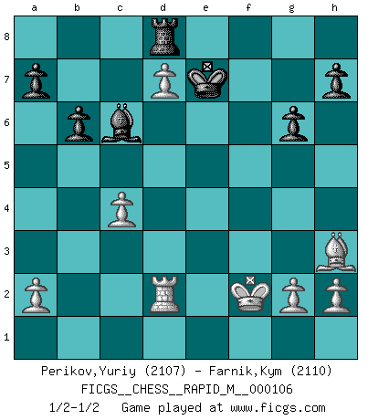 Last move : 1/2-1/2 2019 July 5 11:23:29 [Event "FICGS__CHESS__RAPID_M__000106"] [Site "FICGS"] [Date "2019.06.23"] [Round "1"] [White "Perikov,Yuriy"] [Black "Farnik,Kym"] [Result "1/2-1/2"] [WhiteElo "2107"] [BlackElo "2110"] 1.d4 Nf6 2.c4 g6 3.Nc3 d5 4.cxd5 Nxd5 5.e4 Nxc3 6.bxc3 Bg7 7.Nf3 c5 8.Rb1 O-O 9.Be2 Nc6 10.d5 Ne5 11.Nxe5 Bxe5 12.Qd2 e6 13.f4 Bg7 14.c4 Re8 15.e5 f6 16.d6 fxe5 17.Bb2 exf4 18.Bxg7 Kxg7 19.O-O Rf8 20.Rxf4 Rxf4 21.Qxf4 Qf6 22.Qd2 b6 23.d7 Bb7 24.Rf1 Qd4+ 25.Qxd4+ cxd4 26.Bg4 d3 27.Bxe6 d2 28.Rd1 Kf6 29.Rxd2 Rd8 30.Bh3 Ke7 31.Kf2 Bc6 1/2-1/2 King's Indian defense, 3.Nc3 Kingside Castling by player Black (move 8) Kingside Castling by player White (move 19) This chess game ended in a draw. Follow this game move after move (download)A Chess game is a dialogue, a conversation between a player and his opponent. Each move by the opponent may contain threats or be a blunder, but a player cannot defend against threats or take advantage of blunders if he does not first ask himself: What is my opponent planning after each move ? (Bruce A. Moon) Ich moechte nie einem Club beitreten, der Leute wie mich als Mitglieder aufnimmt. (Woody Allen) La maestría del Ajedrez consiste esencialmente en analizar posiciónes de Ajedrez con precisión. (Mikhail Botvinnik) Le succès, c'est être capable d'aller d'échec en échec sans perdre son enthousiasme. (Winston Churchill) Wisdom begins at the end. (Daniel Webster)