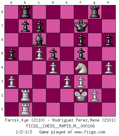 Last move : 1/2-1/2 2019 September 7 15:50:21 [Event "FICGS__CHESS__RAPID_M__000106"] [Site "FICGS"] [Date "2019.06.23"] [Round "1"] [White "Farnik,Kym"] [Black "Rodriguez Perez,Rene"] [Result "1/2-1/2"] [WhiteElo "2110"] [BlackElo "2101"] 1.c4 e6 2.d4 d5 3.Nc3 Nf6 4.cxd5 exd5 5.Bg5 Nbd7 6.e3 h6 7.Bf4 Bb4 8.Bd3 O-O 9.Nge2 Nh5 10.Qb3 a5 11.a3 Nxf4 12.Nxf4 Bxc3+ 13.bxc3 Nb6 14.O-O Qd6 15.Qc2 Bd7 16.Qe2 Bc6 17.Rfb1 Rae8 18.h4 g6 19.Qg4 Nd7 20.Qg3 Nf6 21.c4 Kh8 22.c5 Qd7 23.Rb2 Ne4 24.Qh3 Qxh3 25.Nxh3 Kg7 26.f3 Ng3 27.Kf2 Nf5 28.Bxf5 gxf5 29.Nf4 Rb8 30.Nd3 Rg8 31.Rab1 f6 32.Nf4 Kf7 33.Ke2 Rg7 34.Ke1 R7g8 35.Kf2 1/2-1/2 English Opening Kingside Castling by player Black (move 8) Kingside Castling by player White (move 14) This chess game ended in a draw. Follow this game move after move (download)Chess is played with the mind and not with the hands ! (Renaud and Kahn) Ohne Leiden bildet sich kein Charakter. (Ernst Freiherr von Feuchtersleben) Aquel que toma al Peón de Caballo de la Reina, se pasará la noche a dormir en la calle. (Anónimo) Des points faibles ou des trous dans la position de l'adversaire doivent être occupés par des pièces et non pas par des pions. (Siegbert Tarrasch) Home computers are being called upon to perform many new functions, including the consumption of homework formerly eaten by the dog. (Doug Larson)