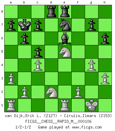 Last move : 1/2-1/2 2019 September 23 3:0:5 [Event "FICGS__CHESS__RAPID_M__000106"] [Site "FICGS"] [Date "2019.06.23"] [Round "1"] [White "van Dijk,Erik L."] [Black "Cirulis,Ilmars"] [Result "1/2-1/2"] [WhiteElo "2127"] [BlackElo "2153"] 1.e4 e5 2.Nf3 Nc6 3.Bb5 Nf6 4.O-O Nxe4 5.d4 Nd6 6.Bxc6 dxc6 7.dxe5 Nf5 8.Qxd8+ Kxd8 9.h3 Bd7 10.Rd1 Be7 11.Bg5 Kc8 12.Bxe7 Nxe7 13.Ng5 h6 14.Nxf7 Re8 15.e6 Bxe6 16.Ne5 Nd5 17.Re1 c5 18.a3 b6 19.c4 Ne7 20.g4 Kb7 21.Nd2 Rad8 1/2-1/2 Ruy Lopez : Berlin defense, Open variation Kingside Castling by player White (move 4) This chess game ended in a draw. Follow this game move after move (download)Botvinnik tried to take the mystery out of Chess, always relating it to situations in ordinary life. He used to call Chess a typical inexact problem similar to those which people are always having to solve in everyday life. (Garry Kasparov) Deine Wertungszahl - vorausgesetzt einige Jahre schachliche Anstrengung - entspricht etwa dem zehnfachen Deines IQ plus 1000. (Jonathan Levitt) La enorme capacidad mental, en la que sin ella no puede un jugador de Ajedrez existir, es demasiado requerida por el Ajedrez al grado de que nunca podrá liberar su mente de este juego. (Albert Einstein) Il n'y a pas de prix trop élevé au scalp de l'ennemi. (Koblentz) All art requires courage. (Anne Tucker)