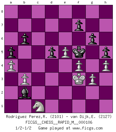Last move : 1/2-1/2 2019 December 5 23:47:46 [Event "FICGS__CHESS__RAPID_M__000106"] [Site "FICGS"] [Date "2019.06.23"] [Round "1"] [White "Rodriguez Perez,Rene"] [Black "van Dijk,Erik L."] [Result "1/2-1/2"] [WhiteElo "2101"] [BlackElo "2127"] 1.e4 c5 2.Nf3 d6 3.d4 cxd4 4.Qxd4 Nc6 5.Bb5 Bd7 6.Bxc6 Bxc6 7.c4 Nf6 8.Nc3 g6 9.O-O Bg7 10.Re1 O-O 11.Qd3 Nd7 12.Be3 Nc5 13.Bxc5 dxc5 14.Qe3 Qa5 15.Nd5 Bxd5 16.cxd5 c4 17.Re2 Rfd8 18.h4 Rac8 19.Rc2 Qa4 20.Qe2 Qa6 21.Rd1 e6 22.d6 Rxd6 23.Rxd6 Qxd6 24.Rxc4 Rxc4 25.Qxc4 Qd1+ 26.Kh2 Bf8 27.b3 h6 28.Ng1 Kg7 29.Nf3 Bd6+ 30.e5 Ba3 31.Qc3 Qb1 32.Qd2 Qe4 33.Qa5 Qf4+ 34.Kg1 Qc1+ 35.Qe1 Qc2 36.Qd2 Qe4 37.Qe1 Qd5 38.Qc3 a5 39.Qd2 Qe4 40.Qe1 Qd3 41.Qd2 Qe4 42.Qe1 Qd5 43.Qd2 Bc5 44.Qxd5 exd5 45.Ne1 h5 46.Nd3 Bd4 47.g3 Kf8 48.a4 Ke7 49.Kg2 Ke6 50.f4 Kf5 51.Kf3 b6 52.Nc1 Bb2 1/2-1/2 Sicilian, Chekhover variation Kingside Castling by player White (move 9) Kingside Castling by player Black (move 10) This chess game ended in a draw. Follow this game move after move (download)I don't believe in psychology. I believe in good moves. (Bobby Fischer) Ein bischen Romantik kann weder im Schach noch in der Liebe schaden. Also versuche ich mich ab und zu daran zu erinnern. (Nigel Short) No es una movida, aún la mejor movida que tu debas buscar, sino un plan comprensible. (Eugene Znosko-Borovsky) Donnez-moi un Cavalier en 6e et je gagnerais toutes mes parties. (Steinitz) The various flowers seem good to different people. (Chinese proverb)