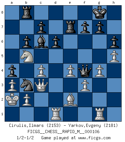 Last move : 1/2-1/2 2019 September 16 9:11:4 [Event "FICGS__CHESS__RAPID_M__000106"] [Site "FICGS"] [Date "2019.06.23"] [Round "1"] [White "Cirulis,Ilmars"] [Black "Yarkov,Evgeny"] [Result "1/2-1/2"] [WhiteElo "2153"] [BlackElo "2181"] 1.c4 e5 2.e4 Nf6 3.Nc3 Bc5 4.Be2 O-O 5.d3 a5 6.Nf3 d6 7.Be3 Re8 8.h3 Nbd7 9.Qc2 b6 10.g4 Nf8 11.O-O-O N6d7 12.d4 exd4 13.Nxd4 Ne6 14.f3 Bb7 15.h4 Bxd4 16.Bxd4 Nxd4 17.Rxd4 Nc5 18.Kb1 a4 19.a3 Qf6 20.R4d1 Qf4 21.Rhg1 h6 22.Nb5 Re7 23.Qc3 Rae8 24.h5 Nb3 25.Ka2 Bc6 26.Rgf1 Rb8 27.Rg1 1/2-1/2 English Opening Kingside Castling by player Black (move 4) Queenside Castling by player White (move 11) This chess game ended in a draw. Follow this game move after move (download)Fischer, who may or may not be mad as a hatter, has every right to be horrified. (Jeremy Silman) Korrekt heißt in Deutschland die Haltung eines Mannes, dessen Benehmen nach dem Urteile seiner Nachbarn seiner Stellung angemessen ist. Um korrekt zu sein, muß man sich der Meinung der anderen anpassen... (Emanuel Lasker) Con o sin el título, Bobby Fischer fue sin lugar a dudas el mas grande jugador de su época. (Burt Hochberg) Nous sommes les pions de la mystérieuse partie d'Echecs jouée par Dieu. Il nous déplace, nous arrête, nous pousse encore, puis nous lance un à un dans la boîte du Néant. Epitaphe sur la tombe de David Janowsky (1868-1927). Don't anthropomorphize computers - they hate it. (Anonymous)