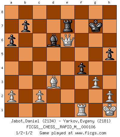 Last move : 1/2-1/2 2019 September 28 9:57:42 [Event "FICGS__CHESS__RAPID_M__000106"] [Site "FICGS"] [Date "2019.06.23"] [Round "1"] [White "Jabot,Daniel"] [Black "Yarkov,Evgeny"] [Result "1/2-1/2"] [WhiteElo "2134"] [BlackElo "2181"] 1.e4 c5 2.Nf3 d6 3.d4 cxd4 4.Nxd4 Nf6 5.Nc3 a6 6.Bg5 e6 7.f4 Qb6 8.Qd2 Qxb2 9.Rb1 Qa3 10.e5 h6 11.Bh4 dxe5 12.fxe5 g5 13.exf6 gxh4 14.Be2 Qa5 15.O-O Nd7 16.Kh1 Qg5 17.Qe1 Nxf6 18.Nf3 Qg7 19.Ne5 Be7 20.Na4 O-O 21.Nb6 Rb8 22.Rb3 Ne4 23.Ned7 Bxd7 24.Nxd7 Nc5 25.Nxc5 Bxc5 26.Qxh4 Bd6 27.R1f3 Kh7 28.Rbe3 f5 29.Rxe6 Rbe8 30.Rxe8 Rxe8 31.Bf1 f4 32.Bd3+ Kh8 33.Rf1 Qg5 34.Qh3 Re7 35.Bc4 Kg7 36.Qc8 h5 37.g3 Qg6 38.Bd3 Qe6 39.Qxe6 1/2-1/2 Sicilian : Najdorf, 7...Qb6 Kingside Castling by player White (move 15) Kingside Castling by player Black (move 20) This chess game ended in a draw. Follow this game move after move (download)As one by one I mowed them down, my superiority soon became apparent. (Jose Capablanca) Sitze auf Deine Hände. (Siegbert Tarrasch) El Ajedrez es en su esencia, un juego. En su forma, un arte. Y en su ejecución, una ciencia. (Baron Tassilo) Aux échecs, l'amour-propre est satisfait quand on remporte la victoire, mais il n'y a pas de honte à être battu. (Benjamin Franklin) You think that education is too expensive ? Try ignorance. (Derek Bok)