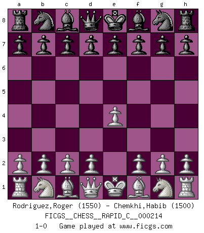Last move : 1-0 2019 August 1 8:39:49 [Event "FICGS__CHESS__RAPID_C__000214"] [Site "FICGS"] [Date "2019.07.01"] [Round "1"] [White "Rodriguez,Roger"] [Black "Chemkhi,Habib"] [Result "1-0"] [WhiteElo "1550"] [BlackElo "1500"] 1.e4 1-0 This chess game has been lost on time (started : 2019.07.01 0:58:44) King's pawn Opening Player White won this chess game. Follow this game move after move (download)Bobby Fischer's current state of mind is indeed a tragedy. One of the world's greatest Chess players - the pride and sorrow of American Chess. (Frank Brady) Woher wissen wir, daß der Neanderthaler Blindschach gespielt hat? -- Bei Ausgrabungen wurden keine Schachbretter und Figuren gefunden. (Anonymous) Aquellos que dicen entender al Ajedrez, no entienden nada. (Robert Hubner) Mon pion favori sur ma case favorite ! Bronstein en parlant d'un coup de pion en h5 quand il avait les Noirs. The message for business people contemplating their place in the cyberspace is simple and direct: get linked or get lost. (Vic Sussman and Kenan Pollack)