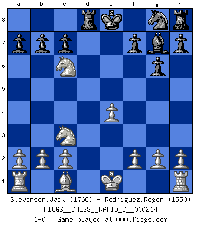 Last move : 1-0 2019 August 10 21:45:52 [Event "FICGS__CHESS__RAPID_C__000214"] [Site "FICGS"] [Date "2019.07.01"] [Round "1"] [White "Stevenson,Jack"] [Black "Rodriguez,Roger"] [Result "1-0"] [WhiteElo "1768"] [BlackElo "1550"] 1.e4 e5 2.Nf3 Nc6 3.Bb5 d6 4.d4 Bd7 5.Nc3 g6 6.Bxc6 Bxc6 7.dxe5 dxe5 8.Qxd8+ Rxd8 9.Nxe5 Bg7 10.Nxc6 1-0 This chess game has been lost on time (started : 2019.07.01 0:58:44) Ruy Lopez : Old Steinitz defense Player White won this chess game. Follow this game move after move (download)Human affairs are like a Chess game: only those who do not take it seriously can be called good players. (Hung Tzu Ch'eng) Matt entspricht nicht immer den Tatsachen. (Savielly Grigorievitsch Tartakower) Cada Peón es potencialmente una Reina. (James Mason) Dieu déplace le joueur, et celui-ci la pièce. Quel Dieu derrière Dieu commence donc la trame ? Arturo Perez-Reverte (prix de littérature policière 1993). Faith : not wanting to know what is true. (Friedrich Nietzsche)