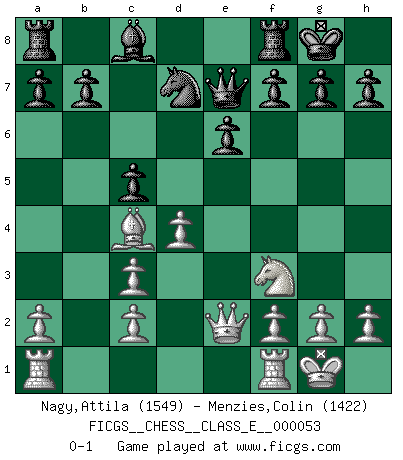 Last move : 0-1 2007 October 19 13:13:42 [Event "FICGS__CHESS__CLASS_E__000053"] [Site "FICGS"] [Date "2007.06.15"] [Round "1"] [White "Nagy,Attila"] [Black "Menzies,Colin"] [Result "0-1"] [WhiteElo "1549"] [BlackElo "1422"] 1.e4 c5 2.Nf3 Nf6 3.Nc3 d5 4.exd5 Nxd5 5.Bc4 Nxc3 6.bxc3 e6 7.O-O Bd6 8.d4 O-O 9.Qe2 Nd7 10.Bg5 Be7 11.Bxe7 Qxe7 0-1 This chess game has been lost on time (started : 2007.06.15 3:38:1) Sicilian : Nimzovich-Rubinstein variation Kingside Castling by player White (move 7) Kingside Castling by player Black (move 8) Player Black won this chess game. Follow this game move after move (download)Chess opens and enriches your mind. (Saudin Robovic) Der Verteidiger gebe der Gewalt nach, aber nur der Gewalt. Er schaffe sich nicht freiwillig, etwa aus Blindheit oder aus Schrecken, irgendwelche Schwächen. Er lasse sich nicht bluffen. (Emanuel Lasker) El juego del Ajedrez no es solamente una diversión quieta; algunas cualidades muy valuables de la mente se pueden adquirir y cultivar con el, como convertirlos en habitos disponibles para toda ocasión; ya que la vida es algo así como el Ajedrez. (Benjamin Franklin) Horreur, mais aussi harmonie suprême : qu'y avait-il en effet au monde en dehors des échecs ? Le brouillard, l'inconnu, le non-être... (Vladimir Nabokov) There's no money in correspondence chess. (John Knudsen)