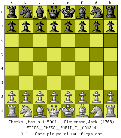 Last move : 0-1 2019 July 31 2:29:47 [Event "FICGS__CHESS__RAPID_C__000214"] [Site "FICGS"] [Date "2019.07.01"] [Round "1"] [White "Chemkhi,Habib"] [Black "Stevenson,Jack"] [Result "0-1"] [WhiteElo "1500"] [BlackElo "1768"] 0-1 This chess game has been lost on time (started : 2019.07.01 0:58:44) Player Black won this chess game. Follow this game move after move (download)Chess is the art of analysis. (Mikhail Botvinnik) Sitze auf Deine Hände. (Siegbert Tarrasch) El Ajedrez es un invernadero donde los frutos del carácter pueden madurar mas completamente que en la vida. (Edward Morgan Foster) Les échecs, c'est la lutte contre l'erreur. (Johannes Zukertort) A shortcut is the longest distance between two points. (Don Groves)