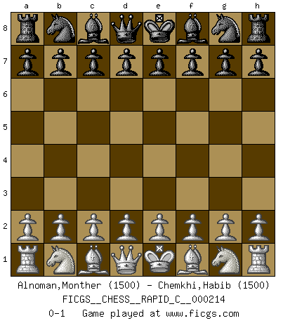 Last move : 0-1 2019 July 31 2:29:47 [Event "FICGS__CHESS__RAPID_C__000214"] [Site "FICGS"] [Date "2019.07.01"] [Round "1"] [White "Alnoman,Monther"] [Black "Chemkhi,Habib"] [Result "0-1"] [WhiteElo "1500"] [BlackElo "1500"] 0-1 This chess game has been lost on time (started : 2019.07.01 0:58:44) Player Black won this chess game. Follow this game move after move (download)The Pin is mightier than the sword. (Fred Reinfeld) Im Blitz ist es einfacher mit einer Figur weniger anzugreifen, als sich mit einer Mehrfigur zu verteidigen. (Mikhail Nekhemyevich Tal) Si pudieramos observar el interior de la cabeza de un jugador de Ajedrez, encontraríamos ahí un mundo lleno de sentimientos, imágenes, ideas, emoción y pasión. (Alfred Binet) Pour moi, les échecs ne sont pas un jeu mais un art. (Alexandre Alekhine) Wisdom begins at the end. (Daniel Webster)