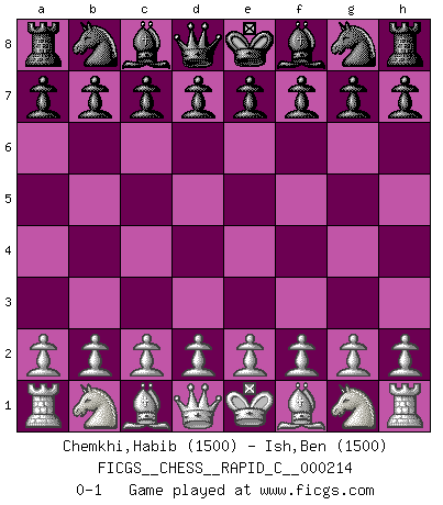 Last move : 0-1 2019 July 31 2:29:47 [Event "FICGS__CHESS__RAPID_C__000214"] [Site "FICGS"] [Date "2019.07.01"] [Round "1"] [White "Chemkhi,Habib"] [Black "Ish,Ben"] [Result "0-1"] [WhiteElo "1500"] [BlackElo "1500"] 0-1 This chess game has been lost on time (started : 2019.07.01 0:58:44) Player Black won this chess game. Follow this game move after move (download)A thorough understanding of the typical mating continuations makes the most complicated sacrificial combinations leading up to them not only not difficult, but almost a matter of course. (Siegbert Tarrasch) Die Partien sind immer verschieden, die Interviews immer die gleichen. (Garry Kasparov) No hay precio que sea tan grande por la cabellera del Rey enemigo. (Koblentz) Les Echecs, c'est l'art de la guerre sans les charniers, c'est la résurrection des morts tombés au champ d'honneur, l'espoir perpétuel, la suprématie de l'intelligence sur la force, la culture de l'esprit. (F. Szpiner) The next best thing to gambling and winning is gambling and loosing. (Nick Dandalos)