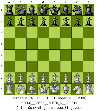 Last move : 0-1 2019 July 31 2:29:47 [Event "FICGS__CHESS__RAPID_C__000214"] [Site "FICGS"] [Date "2019.07.01"] [Round "1"] [White "Gogolauri,Giorgi"] [Black "Alnoman,Monther"] [Result "0-1"] [WhiteElo "1500"] [BlackElo "1500"] 0-1 This chess game has been lost on time (started : 2019.07.01 0:58:44) Player Black won this chess game. Follow this game move after move (download)I play correspondence chess because it is both art and science while chess is art only. (A player at FICGS) Ich spiele 70 Eröffnungssysteme. (Viktor Kortschnoi) El Ajedrez lo es todo: arte, ciencia y deporte. (Anatoly Karpov) Un millionnaire : 'Monsieur Steinitz ! Vous ne participez aux tournois que pour l'argent, alors que moi je n'y viens que pour l'honneur.' Steinitz : 'Chacun joue pour ce qu'il n'a pas'... Unless I accept my faults I will most certainly doubt my virtues. (Hugh Prather)