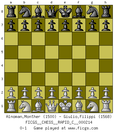 Last move : 0-1 2019 July 31 2:29:47 [Event "FICGS__CHESS__RAPID_C__000214"] [Site "FICGS"] [Date "2019.07.01"] [Round "1"] [White "Alnoman,Monther"] [Black "Giulio,Filippi"] [Result "0-1"] [WhiteElo "1500"] [BlackElo "1568"] 0-1 This chess game has been lost on time (started : 2019.07.01 0:58:44) Player Black won this chess game. Follow this game move after move (download)A win by an unsound combination, however showy, fills me with artistic horror. (Wilhelm Steinitz) Es ist schade, dass viele Schachsportler vergessen, wie wichtig Auftreten und angemessene Kleidung sind. (Alexandra Kosteniuk) El sobresalir en el Ajedrez es un signo de una mente intrigante. (Sir Arthur Conan Doyle) Il vaut mieux sacrifier les pièces de l'adversaire. (Xavier Tartacover) Now you put water in a cup, it becomes the cup; You put water into a bottle it becomes the bottle; You put it in a teapot it becomes the teapot. Water can flow or it can crash. Be water, my friend. (Bruce Lee)