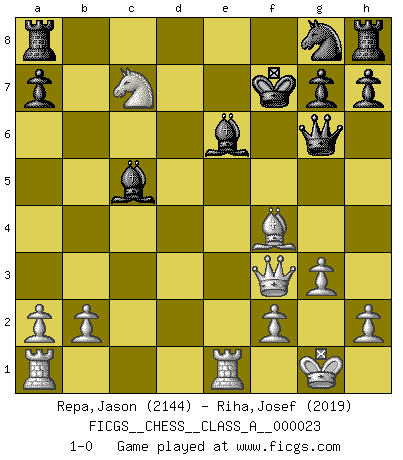 Last move : 1-0 2007 June 23 15:23:9 [Event "FICGS__CHESS__CLASS_A__000023"] [Site "FICGS"] [Date "2007.06.16"] [Round "1"] [White "Repa,Jason"] [Black "Riha,Josef"] [Result "1-0"] [WhiteElo "2144"] [BlackElo "2019"] 1.e4 c5 2.Nf3 d6 3.Bb5+ Nc6 4.Bxc6+ bxc6 5.O-O e5 6.c3 f5 7.exf5 Bxf5 8.d4 e4 9.dxc5 exf3 10.Qxf3 Be6 11.Re1 Kd7 12.Bf4 d5 13.c4 Bxc5 14.cxd5 cxd5 15.Nc3 Qh4 16.g3 Qg4 17.Qd3 Ke7 18.Nxd5+ Kf7 19.Nc7 Qg6 20.Qf3 1-0 Sicilian : Canal-Sokolsky (Nimzovich-Rossolimo, Moscow) attack Kingside Castling by player White (move 5) Player White won this chess game. Follow this game move after move (download)Blessed be the memory of him who gave the world this immortal game. (A. G. Gardiner) Ich hatte meine größten Erfolge, als ich 47 Jahre alt war. Kasparow war noch nicht mal 42 und hat das Schach schon im Stich gelassen. (Viktor Kortschnoi) Un Peón pasado es un criminal, quién debe ser mantenido bajo candado y llave. Leves medidas, tales como vigilancia policiaca, no son suficientes. (Aaron Nimzovich) Shah mat. Le roi est mort. Cri de fierté d'un joueur venant de terrasser son adversaire, courtoisement, sans effusion de sang. Good luck. You're gonna need it. (Han Solo in Star Wars ep.6)