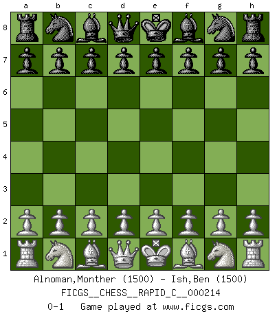 Last move : 0-1 2019 July 31 2:29:47 [Event "FICGS__CHESS__RAPID_C__000214"] [Site "FICGS"] [Date "2019.07.01"] [Round "1"] [White "Alnoman,Monther"] [Black "Ish,Ben"] [Result "0-1"] [WhiteElo "1500"] [BlackElo "1500"] 0-1 This chess game has been lost on time (started : 2019.07.01 0:58:44) Player Black won this chess game. Follow this game move after move (download)It is peculiar but a fact nevertheless, that gamblers in chess always have enthusiastic followers. (Botvinnik) Ich verstehe den Grund nicht, warum die Aufteilung in Frauen und Männer überhaupt im Schach besteht. (Judith Polgar) Los tropiezos estan todos ahí en el tablero, esperando que se cometan. (Savielly Tartakover) Si je n'étais pas joueur d'échecs, je serais le meilleur dans quelque chose d'autre. (Anatoli Karpov) I find your interest interesting. (Gregory House, House M.D.)