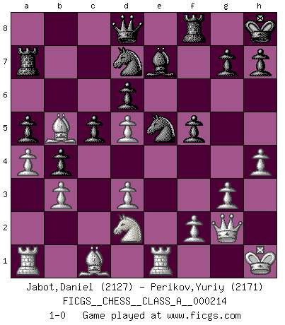 Last move : 1-0 2020 January 8 2:36:51 [Event "FICGS__CHESS__CLASS_A__000214"] [Site "FICGS"] [Date "2019.07.01"] [Round "1"] [White "Jabot,Daniel"] [Black "Perikov,Yuriy"] [Result "1-0"] [WhiteElo "2127"] [BlackElo "2171"] 1.e4 e5 2.Nf3 Nc6 3.Bb5 a6 4.Ba4 Nf6 5.O-O Be7 6.Re1 b5 7.Bb3 O-O 8.h3 Bb7 9.d3 d6 10.a3 Na5 11.Ba2 c5 12.Nbd2 Nc6 13.Nf1 Bc8 14.Ne3 Be6 15.Nd5 Bxd5 16.exd5 Nd4 17.Nd2 Nf5 18.Ne4 a5 19.a4 b4 20.Bc4 Nd7 21.Bb5 Nh4 22.g3 Ng6 23.h4 f5 24.Nd2 Ra7 25.Qf3 e4 26.Qg2 Nge5 27.Kh1 Kh8 28.b3 exd3 29.cxd3 1-0 Ruy Lopez : Closed, 7...O-O Kingside Castling by player White (move 5) Kingside Castling by player Black (move 7) Player White won this chess game. Follow this game move after move (download)Strategy requires thought, tactics require observation. (Max Euwe) Es liegt in der Natur, vernüftig zu denken und unlogisch zu handeln. (Anatole France) El Ajedrez es parte de una cultura y si una cultura esta en decadencia, entonces también el Ajedrez declinará. (Mikhail Botvinnik) Le profane ne songe pas à la somme de jouissance dont il se prive, qui méconnaît ce jeu aux ressources aussi variées que passionnantes. (Jean-Marie Jeanton-Lamarche) A bird doesn't sing because it has an answer, it sings because it has a song. (Maya Angelou)