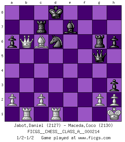Last move : 1/2-1/2 2019 December 22 15:51:52 [Event "FICGS__CHESS__CLASS_A__000214"] [Site "FICGS"] [Date "2019.07.01"] [Round "1"] [White "Jabot,Daniel"] [Black "Maceda,Coco"] [Result "1/2-1/2"] [WhiteElo "2127"] [BlackElo "2130"] 1.e4 c5 2.Nf3 d6 3.d4 cxd4 4.Nxd4 Nf6 5.Nc3 a6 6.Bg5 e6 7.f4 Qb6 8.Qd2 Qxb2 9.Rb1 Qa3 10.e5 h6 11.Bh4 dxe5 12.fxe5 g5 13.exf6 gxh4 14.Be2 Qa5 15.O-O Nd7 16.Kh1 Qg5 17.Qe1 Nxf6 18.Qf2 Rg8 19.Ne4 Nxe4 20.Qxf7+ Kd8 21.Bf3 Nd6 22.Nxe6+ Bxe6 23.Qxe6 Rg6 24.Qb3 Rc8 25.Bxb7 Be7 26.Qb6+ Rc7 27.Bc6 h3 28.Rfd1 1/2-1/2 Sicilian : Najdorf, 7...Qb6 Kingside Castling by player White (move 15) This chess game ended in a draw. Follow this game move after move (download)First-class players lose to second class players because second-class players sometimes play a first-class game. (Tarrasch) Je mehr wir mit Computern analysieren, desto mehr glauben wir an Verteidigung. (Vladimir Kramnik) El muchacho (en ese entonces un niño de 12 años llamado Anatoly Karpov) no tiene ni idea de lo que es el Ajedrez y no hay futuro en absoluto para el en esta profesión. (Mikhail Botvinnik) Un journaliste : 'Vous préférez avoir une dame de plus sur l'échiquier ou au lit ?' Boris Spassky : 'Ca dépend de la position.' The best teachers teach from the heart, not from the book. (Author unknown)