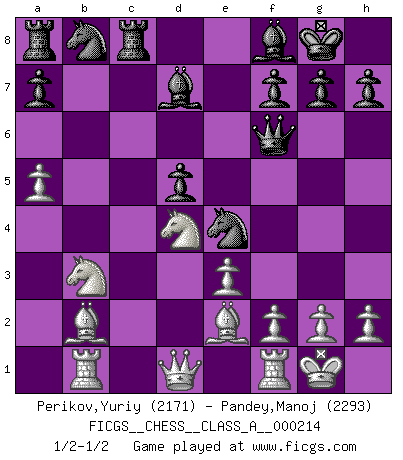 Last move : 1/2-1/2 2019 August 23 6:45:18 [Event "FICGS__CHESS__CLASS_A__000214"] [Site "FICGS"] [Date "2019.07.01"] [Round "1"] [White "Perikov,Yuriy"] [Black "Pandey,Manoj"] [Result "1/2-1/2"] [WhiteElo "2171"] [BlackElo "2293"] 1.d4 Nf6 2.c4 e6 3.Nc3 Bb4 4.e3 O-O 5.Bd3 d5 6.Nf3 b6 7.O-O c5 8.cxd5 exd5 9.dxc5 bxc5 10.Na4 c4 11.Be2 Bd7 12.a3 Bd6 13.Nc3 Be6 14.Nb5 Be7 15.b3 cxb3 16.Nbd4 Ne4 17.Bb2 Qb6 18.Nxb3 Rc8 19.Nfd4 Bd7 20.a4 Bf8 21.a5 Qf6 22.Rb1 1/2-1/2 Nimzo-Indian : 4.e3 O-O, 5.Bd3 d5 Kingside Castling by player Black (move 4) Kingside Castling by player White (move 7) This chess game ended in a draw. Follow this game move after move (download)Half the variations which are calculated in a tournament game turn out to be completely superfluous. Unfortunately, no one knows in advance which half. (Jan Tinman) Ein Schachgenie ist jemand der verdammt gut Schach spielt. (Jonathan Levitt) Siempre es mejor sacrificar los hombres de tu oponente. (Savielly Tartakower) Les échecs sont un jeu par leur forme, un art par leur essence et une science par sa difficulté d'acquisition. Ils peuvent vous procurer autant de plaisir qu'un bon livre ou une belle musique, mais vous n'aurez une réelle joie que si vous arrivez à bien jouer. (Tigran Petrosian) A woman without a man is like a fish without a bicycle. (Gloria Steinem)