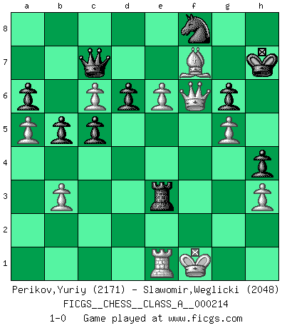 Last move : 1-0 2019 July 14 17:0:5 [Event "FICGS__CHESS__CLASS_A__000214"] [Site "FICGS"] [Date "2019.07.01"] [Round "1"] [White "Perikov,Yuriy"] [Black "Slawomir,Weglicki"] [Result "1-0"] [WhiteElo "2171"] [BlackElo "2048"] 1.e4 g6 2.d4 Bg7 3.Nf3 d6 4.c4 Bg4 5.Be2 Nc6 6.Nbd2 Nf6 7.d5 Nb8 8.O-O O-O 9.h3 Bxf3 10.Bxf3 Nbd7 11.Rb1 Re8 12.b3 e6 13.Bb2 exd5 14.cxd5 h5 15.Qc2 Rc8 16.Rbd1 a6 17.Nc4 b5 18.Na5 c5 19.Nc6 Qb6 20.a4 Nh7 21.Bxg7 Kxg7 22.a5 Qc7 23.g3 Nb8 24.Bg2 Nxc6 25.dxc6 Rcd8 26.Qc3+ Kg8 27.e5 Rxe5 28.Rfe1 Re6 29.Bd5 R6e8 30.Kg2 Rc8 31.f4 Re7 32.g4 h4 33.g5 Rce8 34.f5 Nf8 35.Qf6 Kh7 36.Re4 Rxe4 37.Bxf7 R8e6 38.fxe6 Re2+ 39.Kf1 Re3 40.Re1 1-0 Robatsch (Modern) defense Kingside Castling by player White (move 8) Kingside Castling by player Black (move 8) Player White won this chess game. Follow this game move after move (download)Personally, I rather look forward to a computer program winning the world Chess Championship. Humanity needs a lesson in humility. (Richard Dawkings) Das Schachspiel hat wie die Liebe, die Musik, die Fähigkeit, den Menschen glücklich zu machen. Ich habe ein leises Gefühl des Bedauerns für jeden, der das Schachspiel nicht kennt, so wie ich jeden bedaure, der die Liebe nicht kennt. (Siegbert Tarrasch) El sobresalir en el Ajedrez es un signo de una mente intrigante. (Sir Arthur Conan Doyle) Toutes choses étant égales, c'est la conviction qui gagne. Alliée à une volonté de vaincre, elle sert de détonateur, suscite des idées, disperse les doutes et aide à penser clairement. (Robert Fischer) The Internet isn't free. It just has an economy that makes no sense to capitalism. (Brad Shapcott)