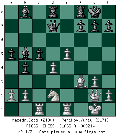 Last move : 1/2-1/2 2019 August 23 16:56:22 [Event "FICGS__CHESS__CLASS_A__000214"] [Site "FICGS"] [Date "2019.07.01"] [Round "1"] [White "Maceda,Coco"] [Black "Perikov,Yuriy"] [Result "1/2-1/2"] [WhiteElo "2130"] [BlackElo "2171"] 1.e4 e5 2.Nf3 Nc6 3.Bb5 a6 4.Ba4 Nf6 5.O-O Be7 6.Re1 b5 7.Bb3 O-O 8.c3 d5 9.exd5 Nxd5 10.Nxe5 Nxe5 11.Rxe5 c6 12.d4 Bd6 13.Re1 Qh4 14.g3 Qh3 15.Be3 Be6 16.Qf3 a5 17.Qg2 Qf5 18.Bd1 b4 19.c4 Nxe3 20.fxe3 Bxc4 21.Nd2 Bb5 22.Rc1 Rad8 23.Bf3 c5 24.e4 Qd7 25.e5 Bb8 1/2-1/2 Ruy Lopez : Closed, 7...O-O Kingside Castling by player White (move 5) Kingside Castling by player Black (move 7) This chess game ended in a draw. Follow this game move after move (download)When you play Bobby, it is not a question if you win or lose. It is a question if you survive. (Boris Spassky) Du musst Deinen Gegner in einen tiefen dunklen Wald führen wo 2+2=5 ist und wo der Weg, der wieder hinausführt, nur breit genug für einen ist. (Mikhail Nekhemyevich Tal) El jugador táctico sabe que hacer cuando hay algo que hacer; mientras que el estratega sabe que hacer cuando no hay nada que hacer. (Gerald Abrahams) Mais l'homme est une créature légère et illogique : semblable au joueur d'échecs, il n'aime que le processus du but à atteindre, non le but lui-même. (Dostoïevsky) It is not titles that honor men, but men that honor titles. (Niccolo Machiavelli)