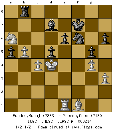 Last move : 1/2-1/2 2020 January 2 6:34:6 [Event "FICGS__CHESS__CLASS_A__000214"] [Site "FICGS"] [Date "2019.07.01"] [Round "1"] [White "Pandey,Manoj"] [Black "Maceda,Coco"] [Result "1/2-1/2"] [WhiteElo "2293"] [BlackElo "2130"] 1.e4 c5 2.Nf3 d6 3.d4 cxd4 4.Nxd4 Nf6 5.Nc3 a6 6.h3 e6 7.g4 h6 8.Bg2 Be7 9.Qd3 Nfd7 10.Be3 Ne5 11.Qe2 b5 12.f4 Nc4 13.Nf5 Nxb2 14.O-O O-O 15.Nxe7+ Qxe7 16.e5 d5 17.Qf2 Qc7 18.Bc5 Nd7 19.Bxf8 Nxf8 20.Qd4 Qc4 21.Qxc4 Nxc4 22.a4 Ne3 23.axb5 Nxf1 24.Bxf1 a5 25.Kf2 Nd7 26.Ke3 g5 27.f5 Nxe5 28.Kd4 Nd7 29.Re1 Nf6 30.fxe6 fxe6 31.Na4 Rb8 32.Nc5 Kf7 33.c4 Bd7 34.Na6 1/2-1/2 Sicilian : Najdorf, Adams attack Kingside Castling by player White (move 14) Kingside Castling by player Black (move 14) This chess game ended in a draw. Follow this game move after move (download)Good positions don't win games, good moves do. (Gerald Abrahams) Alle offensichtlichen Züge sehen nach dem Spiel in der Analyse verdächtig aus. (Viktor Kortschnoi) Combinaciones deslumbrantes son para la mayoría, mover madera es para los pocos. (Georg Kieninger) On a dit que l'homme se distingue de l'animal par le fait qu'il achète plus de livres qu'il ne peut en lire. Je voudrais suggérer qu'inclure à la liste des livres quelques livres d'échecs rendrait la distinction manifeste. (Edward Lasker) Who needs drugs and alcohol if he can play Big Chess at FICGS ? (Heinz-Georg Lehnhoff)