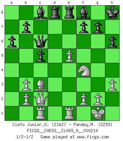Last move : 1/2-1/2 2019 November 12 10:56:1 [Event "FICGS__CHESS__CLASS_A__000214"] [Site "FICGS"] [Date "2019.07.01"] [Round "1"] [White "Cleto Junior,Dirceu"] [Black "Pandey,Manoj"] [Result "1/2-1/2"] [WhiteElo "2162"] [BlackElo "2293"] 1.e4 e5 2.Nf3 Nc6 3.Bb5 Nf6 4.d4 exd4 5.O-O a6 6.Ba4 Be7 7.e5 Ne4 8.Nxd4 O-O 9.Re1 Nxd4 10.Qxd4 Nc5 11.Nc3 d6 12.Bb3 c6 13.Ne4 Nxb3 14.axb3 d5 15.Ng3 c5 16.Qd3 Re8 17.h3 d4 18.Nh5 Bf8 19.Bh6 Kh8 20.Bd2 Qb6 21.Nf4 Bd7 22.Qg3 Rac8 23.Rac1 h6 24.Qf3 Qc6 25.Qd3 Rcd8 26.c3 dxc3 27.Bxc3 Be6 28.Qc2 Bc8 1/2-1/2 Ruy Lopez : Berlin defense, Nyholm attack Kingside Castling by player White (move 5) Kingside Castling by player Black (move 8) This chess game ended in a draw. Follow this game move after move (download)I give 98 percent of my mental energy to Chess. Others give only 2 percent. (Bobby Fischer) Sie führen leise Selbstgespräche, schlürfen lautstark ihre Getränke, schmatzen hörbar beim Essen, blasen ihrem Gegenüber Rauch in die Augen, niesen ihm ins Gesicht, starren ihn unverwandt an, bis er sich unter ihren Blicken windet, rutschen ständig auf ihrem Stuhl hin und her, rülpsen und bohren in der Nase. (Anonymous) Tu no necesitas jugar muy bien, únicamente ayudar a tu oponenet a que juegue muy mal. (Genrikh Chepukaitis) Les Echecs mettent en conflit, non pas deux intelligences, mais deux volontés. (Lasker) If computers get too powerful, we can organize them into committees. That'll do them in. (Anonymous)