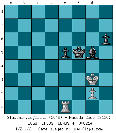 Last move : 1/2-1/2 2019 November 3 16:37:35 [Event "FICGS__CHESS__CLASS_A__000214"] [Site "FICGS"] [Date "2019.07.01"] [Round "1"] [White "Slawomir,Weglicki"] [Black "Maceda,Coco"] [Result "1/2-1/2"] [WhiteElo "2048"] [BlackElo "2130"] 1.d4 d5 2.c4 e6 3.Nc3 Nf6 4.cxd5 exd5 5.Bg5 c6 6.Qc2 h6 7.Bh4 g6 8.e3 Bf5 9.Bd3 Bxd3 10.Qxd3 Bg7 11.f4 Qd6 12.Nf3 O-O 13.O-O Nbd7 14.Ne5 a6 15.a4 Qe6 16.h3 Ne8 17.e4 dxe4 18.Nxe4 Nd6 19.Nxd6 Qxd6 20.Rad1 Qd5 21.Nxd7 Qxd7 22.f5 Kh7 23.f6 Bh8 24.Bg3 Qd5 25.b4 Rfe8 26.Be5 a5 27.bxa5 Rxa5 28.h4 c5 29.h5 Rg8 30.Rc1 b6 31.Rf3 Rxa4 32.Rh3 Rxd4 33.Bxd4 Qxd4+ 34.Qxd4 cxd4 35.Rc7 Rf8 36.hxg6+ Kxg6 37.Rc6 b5 38.Rg3+ Kf5 39.Rf3+ Kg6 40.Rb6 Re8 41.Kf2 b4 42.Rd3 Re6 43.Rxe6 fxe6 44.Rxd4 Bxf6 45.Rxb4 Kf5 46.Rb1 e5 47.Kg3 Bg5 48.Rd1 Ke4 49.Re1+ Kf5 1/2-1/2 QGD : Exchange, positional line, 6.Qc2 Kingside Castling by player Black (move 12) Kingside Castling by player White (move 13) 10 pieces endgame at move 43 : White KRPP , Black KBPPPP WHITE : King + 1 Rook 2 Pawns BLACK : King + 1 Bishop 4 Pawns 9 pieces endgame at move 44 : White KRPP , Black KBPPP WHITE : King + 1 Rook 2 Pawns BLACK : King + 1 Bishop 3 Pawns 8 pieces endgame at move 44 : White KRP , Black KBPPP WHITE : King + 1 Rook 1 Pawn BLACK : King + 1 Bishop 3 Pawns 7 pieces endgame at move 45 : White KRP , Black KBPP WHITE : King + 1 Rook 1 Pawn BLACK : King + 1 Bishop 2 Pawns This chess game ended in a draw. Follow this game move after move (download)Chess mastery essentially consists of analyzing Chess positions accurately. (Mikhail Botvinnik) Obwohl ich alt bin, darf mir niemand den Finger in den Mund stecken, sonst beisse ich. (Wilhelm Steinitz) En la perfecta combinación de Ajedrez como en una historia corta de primera clase, toda la trama y contra trama deberá conducir hacia un final sorprendente, el interes no es mitigado hasta el último momento. (Yates and Winter) Les échecs sont utiles à l'exercice de la faculté de penser et à celle de l'imagination. Car nous devons posséder une méthode élaborée pour atteindre des buts partout où nous devons conduire notre raison. (Leibnitz) Lottery : A tax on people who are bad at math. (Author unknown)