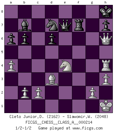 Last move : 1/2-1/2 2019 July 13 14:16:58 [Event "FICGS__CHESS__CLASS_A__000214"] [Site "FICGS"] [Date "2019.07.01"] [Round "1"] [White "Cleto Junior,Dirceu"] [Black "Slawomir,Weglicki"] [Result "1/2-1/2"] [WhiteElo "2162"] [BlackElo "2048"] 1.e4 c5 2.Nf3 e6 3.d4 cxd4 4.Nxd4 a6 5.Nc3 Qc7 6.Bd3 Nf6 7.f4 Bb4 8.O-O Bc5 9.Be3 d6 10.Kh1 Nbd7 11.Qe1 O-O 12.a4 b6 13.Rf3 Ng4 14.Bg1 Bb7 15.Qh4 Ngf6 16.Raf1 Qd8 17.Be3 Ne8 18.Qe1 Nef6 19.Rh3 Ng4 20.Bg1 Kh8 21.Rh4 Nh6 22.Be3 Qe8 23.f5 exf5 24.Nxf5 Nxf5 25.Rxf5 g6 26.Rf1 Bxe3 27.Qxe3 Qe7 28.Qh6 f6 29.Qxg6 f5 30.Qh6 fxe4 31.Rxf8+ Rxf8 32.Nxe4 Rf7 33.h3 1/2-1/2 Sicilian : Kan, 5.Nc3 Kingside Castling by player White (move 8) Kingside Castling by player Black (move 11) This chess game ended in a draw. Follow this game move after move (download)Bobby is the most misunderstood, misquoted celebrity walking the face of this earth. (Yasser Seirawan) Wenn es im Universum noch irgendwo intelligente Lebewesen gibt, dann kennen sie Go. (Emanuel Lasker) Personalmente, yo prefiero mirar hacia el futuro en donde un programa de computadora gane el título mundial de Ajedrez. La humanidad necesita una lección de humildad. (Richard Dawkings) Les réformistes prétendent que les progrès de la théorie conduiront à la disparition des échecs, et qu'il faut, pour leur rendre vie, en remanier les règles. En réalité, qu'exprime cette affirmation? Le mépris de l'intuition, de l'imagination et de tous les autres éléments qui font des échecs un art. (Alexander Alekhine) There is a great deal of difference between an eager man who wants to read a book and a tired man who wants a book to read. (G.K. Chesterton)