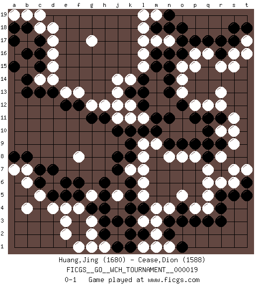 Last move : 0-1 2020 March 27 6:54:21 [Event "FICGS__GO__WCH_TOURNAMENT__000019"] [Site "FICGS"] [Date "2019.07.01"] [Round "1"] [Black "Huang,Jing"] [White "Cease,Dion"] [Result "0-1"] [Rating 1 "1680"] [Rating 2 "1588"] 1.q17 d16 2.q3 d4 3.f3 r15 4.o16 q5 5.r5 r6 6.r4 q6 7.o4 m3 8.n3 m4 9.j3 n4 10.o3 o5 11.c6 f4 12.g4 e3 13.f5 e4 14.f2 g5 15.f6 g3 16.h4 g2 17.h6 q12 18.c17 d17 19.c16 d15 20.b14 m17 21.m16 l16 22.m15 n17 23.o17 l15 24.l14 k14 25.k13 j14 26.l13 j13 27.d13 c14 28.c13 b15 29.c15 d14 30.b13 c18 31.b16 l7 32.p11 p12 33.n11 d6 34.d7 c5 35.e6 f13 36.f12 e13 37.e12 g12 38.g11 r10 39.r16 b17 40.a15 s16 41.s17 h12 42.h11 j5 43.h5 j11 44.j10 b6 45.c7 k11 46.k10 b7 47.b8 n8 48.p9 s15 49.b18 d18 50.r9 s9 51.q10 q16 52.r17 s11 53.r11 s10 54.q11 r13 55.o12 b4 56.a8 r12 57.n18 l17 58.m18 l18 59.j7 m2 60.n2 k7 61.j8 q4 62.r3 s6 63.s5 l11 64.m11 r8 65.q9 b19 66.a18 o8 67.k6 l6 68.k5 o14 69.n14 o13 70.n13 p16 71.p17 o15 72.l10 e2 73.h2 m9 74.m10 m19 75.o18 a7 76.d5 p4 77.p3 l5 78.k4 j12 79.k2 t17 80.t18 t16 81.s18 p8 82.o9 l9 83.k8 l8 84.q8 q7 85.n19 l19 86.t6 s7 87.n9 h1 88.j1 g1 89.h3 f1 90.k9 p15 91.e5 l1 92.k1 g17 93.l12 n1 94.o1 l3 95.k3 t7 96.t5 m1 97.n16 c19 98.a17 f8 99.l4 a19 100.n15 k12 101.l2 pass 102.pass pass 0-1 Here are the names of the openings (joseki) played in the four corners : Corner d4 : d4 f3 Hoshi (Hwajeom, Seongjeom, Xingwei`) 4-4 Point. The star or hoshi (4-4) point, emphasizing influence at the potential expense of territory. Ikken Kakari (Hankan Keolch'im, Yi Gua`jiao~, 1-Space Low Approach). Black 2 is the standard approach move to the 4-4. Corner q16 : q17 r15 Komoku (Somok, Xiao~mu`) 3-4 Point. The komoku (3-4) point is the traditional corner enclosure move.. Ikken Kakari (Hankan Keolch'im, Yi Gua`jiao~, 1-Space Low Pincer). The small knight move is the basic approach move to the 3-4 point stone. It has been continually used for over four centuries. There are limitless variations, with new moves constantly being discovered. White 2 opens the door to a treaure store of joseki. Corner q4 : q3 q5 Komoku (Somok, Xiao~mu`) 3-4 Point. The komoku (3-4) point is the traditional corner enclosure move.. Ikken Takagakari (Hankan Nop'dakeolch'im, Yi Gaogua`jiao~, 1-Space High Approach). The 5-4 approach move has become more popular in modern times, as modern Go emphasizes speed and influence. Corner d16 : d16 c17 Hoshi (Hwajeom, Seongjeom, Xingwei`) 4-4 Point. The star or hoshi (4-4) point, emphasizing influence at the potential expense of territory. Player White won this Go (weiqi, baduk) game. Follow this game move after move (download)In opponents' sphere of influence, avoid sharp conflict, don't move too deep. (Otake Hideo, 9p) Whenever people agree with me, I always feel I must be wrong. (Oscar Wilde)