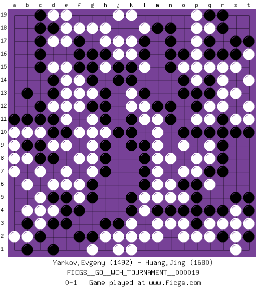 Last move : 0-1 2020 March 23 5:49:30 [Event "FICGS__GO__WCH_TOURNAMENT__000019"] [Site "FICGS"] [Date "2019.07.01"] [Round "1"] [Black "Yarkov,Evgeny"] [White "Huang,Jing"] [Result "0-1"] [Rating 1 "1492"] [Rating 2 "1680"] 1.q4 d4 2.r16 d17 3.c15 p16 4.f16 d15 5.d14 e15 6.c16 e17 7.c17 e14 8.d13 j16 9.n17 r17 10.l17 k17 11.l16 r15 12.j15 h15 13.j14 k16 14.k15 l15 15.h16 h17 16.g16 g18 17.k18 j17 18.j18 h18 19.g14 e13 20.e12 g13 21.h13 f12 22.g12 f13 23.n15 e11 24.q16 q15 25.q17 p17 26.s16 o15 27.o14 p14 28.o13 q18 29.r18 p18 30.s17 q12 31.r10 p11 32.o16 p15 33.n11 q9 34.r9 q8 35.r8 q6 36.q7 p7 37.r7 o9 38.p6 o7 39.o6 n6 40.n7 m6 41.o4 m8 42.o8 p8 43.q10 n8 44.c11 d12 45.c12 g11 46.k11 c7 47.d3 c3 48.e3 c4 49.h3 o2 50.p10 s13 51.c9 r3 52.r4 q3 53.c2 b2 54.m4 m2 55.s3 s2 56.s14 s15 57.s12 t14 58.e4 e6 59.p3 p2 60.l7 m7 61.r2 q2 62.t2 s1 63.e5 d6 64.g6 f6 65.g5 k3 66.k2 j2 67.j3 l2 68.k4 k1 69.h11 h10 70.h12 g9 71.l6 h2 72.g2 b8 73.d11 b10 74.n18 r12 75.b9 a9 76.d8 e9 77.c8 b6 78.h7 f8 79.p13 s11 80.q13 r13 81.o10 m10 82.k9 m11 83.d1 c10 84.d10 d9 85.a11 a10 86.b11 a8 87.l13 s4 88.s5 t3 89.d18 e18 90.c18 e12 91.b13 l12 92.f17 f18 93.m12 l11 94.h8 k13 95.n12 k12 96.k14 j19 97.s10 l18 98.m18 k19 99.d5 c5 100.l3 k2 101.q14 r14 102.e10 f10 103.f7 e7 104.t10 t11 105.b1 a2 106.b3 b4 107.t5 o3 108.p4 f5 109.f4 g1 110.h1 j1 111.f2 m5 112.b7 a7 113.r11 t12 114.k10 l5 115.k5 l4 116.n4 m3 117.l9 m9 118.l8 d19 119.c19 e19 120.h9 g7 121.j10 g10 122.q19 p19 123.r19 n3 124.f15 f14 125.g15 t16 126.t17 g8 127.t4 s3 128.p12 q11 129.n16 o5 130.p5 n5 0-1 Here are the names of the openings (joseki) played in the four corners : Corner d16 : d17 c15 Komoku (Somok, Xiao~mu`) 3-4 Point. The komoku (3-4) point is the traditional corner enclosure move.. Ikken Kakari (Hankan Keolch'im, Yi Gua`jiao~, 1-Space Low Pincer). The small knight move is the basic approach move to the 3-4 point stone. It has been continually used for over four centuries. There are limitless variations, with new moves constantly being discovered. Black 2 opens the door to a treaure store of joseki. Corner q16 : r16 p16 Komoku (Somok, Xiao~mu`) 3-4 Point. The komoku (3-4) point is the traditional corner enclosure move.. Ikken Takagakari (Hankan Nop'dakeolch'im, Yi Gaogua`jiao~, 1-Space High Approach). The 5-4 approach move has become more popular in modern times, as modern Go emphasizes speed and influence. Corner q4 : q4 q9 Hoshi (Hwajeom, Seongjeom, Xingwei`) 4-4 Point. The star or hoshi (4-4) point, emphasizing influence at the potential expense of territory. Player White won this Go (weiqi, baduk) game. Follow this game move after move (download)Conservative and slow will win. Believe it ! (Anonymous) O divine art of subtlety and secrecy! Through you we learn to be invisible, through you inaudible and hence we can hold the enemy's fate in our hands. (Sun Tzu)
