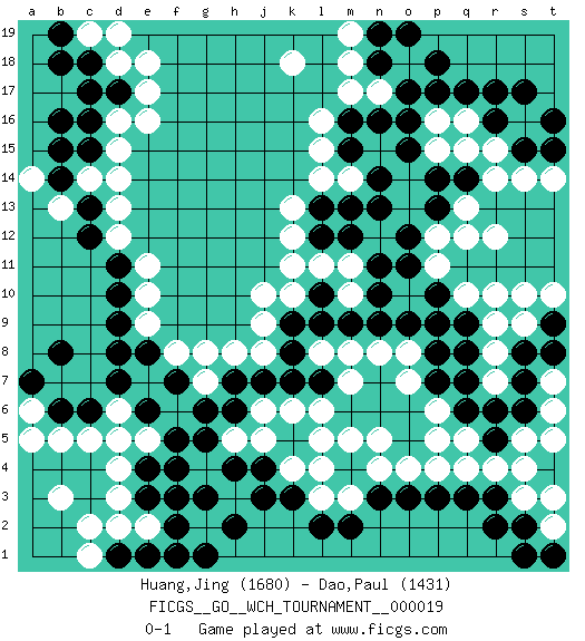 Last move : 0-1 2019 December 7 8:54:47 [Event "FICGS__GO__WCH_TOURNAMENT__000019"] [Site "FICGS"] [Date "2019.07.01"] [Round "1"] [Black "Huang,Jing"] [White "Dao,Paul"] [Result "0-1"] [Rating 1 "1680"] [Rating 2 "1431"] 1.q17 q4 2.c16 d4 3.r6 e17 4.c6 d15 5.c15 d14 6.c13 r15 7.o16 d13 8.c12 d12 9.d11 e11 10.d10 e10 11.d9 c14 12.b14 m17 13.m16 b13 14.b16 a14 15.b15 l16 16.m15 n17 17.o17 r12 18.r16 s16 19.s17 r9 20.o3 p6 21.r3 q16 22.r17 r4 23.q3 p4 24.p3 l15 25.m13 m14 26.n14 l14 27.n13 k12 28.f4 b5 29.b6 c5 30.e6 e9 31.d8 d2 32.e3 n5 33.m4 n4 34.n3 e2 35.f2 l6 36.k5 k6 37.n10 d16 38.c18 j5 39.j4 k4 40.k3 l5 41.j3 a6 42.a7 a5 43.b8 l3 44.l2 o18 45.p18 p11 46.l10 m11 47.n11 m10 48.m9 l11 49.o9 d18 50.c17 d3 51.k9 j10 52.q8 r8 53.q9 q10 54.q7 j9 55.q14 r14 56.n18 m18 57.o19 s3 58.s2 s5 59.s6 t2 60.s1 k10 61.l9 q13 62.p14 k18 63.s15 s14 64.t16 m3 65.m2 l4 66.e8 f8 67.f7 g8 68.t9 s10 69.h6 h5 70.g6 g2 71.g3 f1 72.f3 b3 73.h2 c19 74.b19 d19 75.d17 e18 76.b18 q15 77.p13 t10 78.t8 t6 79.s7 n8 80.n9 o8 81.p10 p12 82.o12 m8 83.g1 t14 84.o11 r10 85.e1 p15 86.o15 m19 87.l13 k13 88.m12 q12 89.l12 k11 90.d1 c1 91.f1 c2 92.n16 e16 93.p7 o7 94.q6 o4 95.l7 l8 96.k7 m7 97.k8 h8 98.h4 j6 99.g5 e5 100.f5 d6 101.d7 d5 102.t15 p5 103.n19 p16 104.r5 t5 105.r2 s4 106.j7 j8 107.h7 g7 108.t1 t3 109.p17 t7 110.s8 r7 111.p9 s9 112.p8 q5 113.e4 m5 0-1 Here are the names of the openings (joseki) played in the four corners : Corner q4 : q4 r6 Hoshi (Hwajeom, Seongjeom, Xingwei`) 4-4 Point. The star or hoshi (4-4) point, emphasizing influence at the potential expense of territory. Ikken Kakari (Hankan Keolch'im, Yi Gua`jiao~, 1-Space Low Approach). Black 2 is the standard approach move to the 4-4. Corner d16 : c16 e17 Komoku (Somok, Xiao~mu`) 3-4 Point. The komoku (3-4) point is the traditional corner enclosure move.. Ikken Kakari (Hankan Keolch'im, Yi Gua`jiao~, 1-Space Low Pincer). The small knight move is the basic approach move to the 3-4 point stone. It has been continually used for over four centuries. There are limitless variations, with new moves constantly being discovered. White 2 opens the door to a treaure store of joseki. Corner d4 : d4 c6 Hoshi (Hwajeom, Seongjeom, Xingwei`) 4-4 Point. The star or hoshi (4-4) point, emphasizing influence at the potential expense of territory. Ikken Kakari (Hankan Keolch'im, Yi Gua`jiao~, 1-Space Low Approach). Black 2 is the standard approach move to the 4-4. Corner q16 : q17 r15 Komoku (Somok, Xiao~mu`) 3-4 Point. The komoku (3-4) point is the traditional corner enclosure move.. Ikken Kakari (Hankan Keolch'im, Yi Gua`jiao~, 1-Space Low Pincer). The small knight move is the basic approach move to the 3-4 point stone. It has been continually used for over four centuries. There are limitless variations, with new moves constantly being discovered. White 2 opens the door to a treaure store of joseki. Player White won this Go (weiqi, baduk) game. Follow this game move after move (download)The weak player fears ko, the strong player seeks it. (Bill Taylor) Computers make it easier to do a lot of things, but most of the things they make it easier to do don't need to be done. (Andy Rooney)