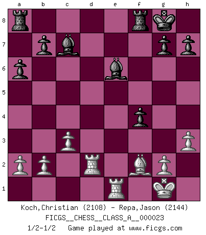 Last move : 1/2-1/2 2007 July 10 9:38:2 [Event "FICGS__CHESS__CLASS_A__000023"] [Site "FICGS"] [Date "2007.06.16"] [Round "1"] [White "Koch,Christian"] [Black "Repa,Jason"] [Result "1/2-1/2"] [WhiteElo "2108"] [BlackElo "2144"] 1.e4 e6 2.d4 d5 3.Nd2 c5 4.exd5 Qxd5 5.Ngf3 cxd4 6.Bc4 Qd6 7.O-O Nf6 8.Nb3 Nc6 9.Nbxd4 Nxd4 10.Nxd4 a6 11.c3 Qc7 12.Qe2 Bd6 13.h3 O-O 14.Bg5 Ne4 15.Qxe4 Qxc4 16.Rfd1 f6 17.Be3 f5 18.Qd3 Qxd3 19.Rxd3 Bc7 20.f4 e5 21.fxe5 f4 22.Bf2 Bxe5 23.Re1 Bc7 24.Rd2 Bd7 25.Ne6 Bxe6 1/2-1/2 French : Tarrasch, Open variation Kingside Castling by player White (move 7) Kingside Castling by player Black (move 13) This chess game ended in a draw. Follow this game move after move (download)What is the object of playing a gambit opening?... To acquire a reputation of being a dashing player at the cost of losing a game. (Siegbert Tarrasch) Über die Verhaftung Bobby Fischers: Warum es die Bush-Administration für nötig befindet einen 61 Jahre alten Mann zu hetzten, der für niemanden ausser sich selbste eine Gefahr darstellt ist ein Rätsel. (Nigel Short) Los Peones son nacidos libres, y aún así, se encuentran por doquier encadenados. (Rick Kennedy) La tactique est l'élément le plus important du milieu de jeu. (Siegbert Tarrasch) If everyone is thinking alike, then somebody isn't thinking. (US General George S. Patton)