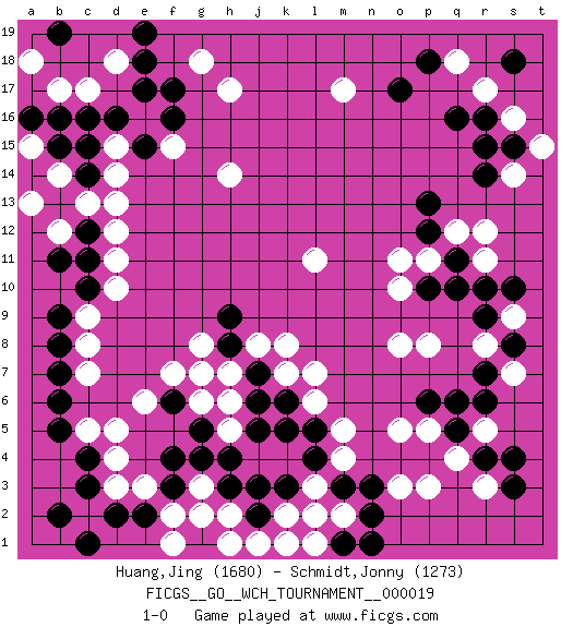 Last move : 1-0 2020 February 4 15:56:18 [Event "FICGS__GO__WCH_TOURNAMENT__000019"] [Site "FICGS"] [Date "2019.07.01"] [Round "1"] [Black "Huang,Jing"] [White "Schmidt,Jonny"] [Result "1-0"] [Rating 1 "1680"] [Rating 2 "1273"] 1.q16 q4 2.d16 d4 3.r6 o3 4.c3 r12 5.r14 d3 6.c4 d5 7.b6 r8 8.r4 r3 9.s3 r5 10.s4 c5 11.b5 c7 12.q5 p5 13.q6 p3 14.p6 o5 15.r10 h17 16.f17 l11 17.j3 m17 18.o17 h14 19.q11 c13 20.c15 g3 21.m3 m5 22.l5 l6 23.k6 l7 24.k5 k7 25.j7 j8 26.h8 h7 27.j6 o8 28.g7 h6 29.g5 g8 30.h9 h5 31.h4 g6 32.f6 f7 33.j5 g7 34.g4 k8 35.c11 e6 36.f3 d12 37.b7 c9 38.b13 b14 39.c14 b12 40.c12 d13 41.b11 a13 42.b9 d11 43.c10 q12 44.p12 p11 45.p10 o11 46.p13 r11 47.q10 p8 48.s10 c8 49.b8 d10 50.b15 o10 51.s8 f2 52.g2 e3 53.f4 h2 54.g1 r17 55.r16 h1 56.h3 f1 57.e2 g3 58.d2 s7 59.r7 q18 60.p18 d18 61.e17 b17 62.b16 c17 63.e18 s16 64.s18 g18 65.e19 k2 66.k3 s14 67.s15 t15 68.r15 s9 69.r9 d14 70.e15 f15 71.f16 d15 72.c16 c2 73.b2 m2 74.n2 l3 75.l4 l2 76.j2 j1 77.n3 m4 78.k1 l1 79.n1 g2 80.m1 k1 81.c1 a18 82.b19 a15 83.a16 1-0 Here are the names of the openings (joseki) played in the four corners : Corner q4 : q4 r6 Hoshi (Hwajeom, Seongjeom, Xingwei`) 4-4 Point. The star or hoshi (4-4) point, emphasizing influence at the potential expense of territory. Ikken Kakari (Hankan Keolch'im, Yi Gua`jiao~, 1-Space Low Approach). Black 2 is the standard approach move to the 4-4. Corner d4 : d4 c3 Hoshi (Hwajeom, Seongjeom, Xingwei`) 4-4 Point. The star or hoshi (4-4) point, emphasizing influence at the potential expense of territory. Corner q16 : q16 r12 Hoshi (Hwajeom, Seongjeom, Xingwei`) 4-4 Point. The star or hoshi (4-4) point, emphasizing influence at the potential expense of territory. Corner d16 : d16 h17 Hoshi (Hwajeom, Seongjeom, Xingwei`) 4-4 Point. The star or hoshi (4-4) point, emphasizing influence at the potential expense of territory. Player Black won this Go (weiqi, baduk) game. Follow this game move after move (download)Strange things happen at the one-two points. (Anonymous) Memory is a way of holding onto the things you love, the things you are, the things you never want to lose. (from the television show: The Wonder Years)