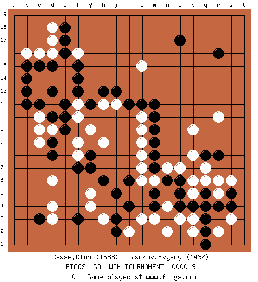 Last move : 1-0 2019 November 21 16:0:19 [Event "FICGS__GO__WCH_TOURNAMENT__000019"] [Site "FICGS"] [Date "2019.07.01"] [Round "1"] [Black "Cease,Dion"] [White "Yarkov,Evgeny"] [Result "1-0"] [Rating 1 "1588"] [Rating 2 "1492"] 1.r16 d4 2.q4 d17 3.o17 c11 4.f3 d6 5.c15 c16 6.e16 d16 7.d15 e15 8.d11 d12 9.c12 c13 10.b12 c10 11.f15 e14 12.d13 d14 13.e12 c14 14.f14 e13 15.f13 f12 16.d9 c9 17.g12 f11 18.b15 f16 19.e17 d12 20.e18 b16 21.e11 d18 22.b14 h3 23.b13 d10 24.d13 o3 25.e10 q6 26.o4 n4 27.o5 p3 28.q5 r6 29.q3 o7 30.s5 n5 31.p7 p8 32.o6 n7 33.n6 m6 34.n3 m3 35.m7 l6 36.q8 q7 37.m5 n2 38.m4 p5 39.p4 p6 40.n3 l3 41.c3 d3 42.k4 r5 43.r4 s3 44.r8 n4 45.k6 l7 46.s4 s6 47.m8 l8 48.m9 l9 49.m10 p10 50.j5 l10 51.m11 l11 52.m12 h9 53.j2 r2 54.q2 p2 55.q1 g4 56.j3 k2 57.h6 r11 58.l12 l15 59.k12 j12 60.j13 h12 61.h13 g10 62.g8 f9 63.d8 f8 64.g7 g5 65.f7 1-0 Here are the names of the openings (joseki) played in the four corners : Corner d4 : d4 f3 Hoshi (Hwajeom, Seongjeom, Xingwei`) 4-4 Point. The star or hoshi (4-4) point, emphasizing influence at the potential expense of territory. Ikken Kakari (Hankan Keolch'im, Yi Gua`jiao~, 1-Space Low Approach). Black 2 is the standard approach move to the 4-4. Corner q4 : q4 o3 Hoshi (Hwajeom, Seongjeom, Xingwei`) 4-4 Point. The star or hoshi (4-4) point, emphasizing influence at the potential expense of territory. Ikken Kakari (Hankan Keolch'im, Yi Gua`jiao~, 1-Space Low Approach). White 2 is the standard approach move to the 4-4. Player Black won this Go (weiqi, baduk) game. Follow this game move after move (download)Dead group ? Always win ko fights ! (Anonymous) Luck is the residue of design. (John Milton)
