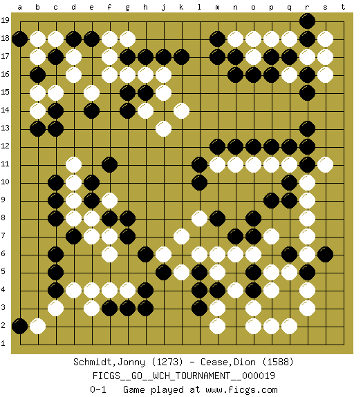 Last move : 0-1 2020 February 4 15:56:25 [Event "FICGS__GO__WCH_TOURNAMENT__000019"] [Site "FICGS"] [Date "2019.07.01"] [Round "1"] [Black "Schmidt,Jonny"] [White "Cease,Dion"] [Result "0-1"] [Rating 1 "1273"] [Rating 2 "1588"] 1.q4 q16 2.c4 d16 3.c14 r6 4.e14 c15 5.c9 b14 6.r13 r10 7.r11 q11 8.q12 s11 9.r12 p11 10.p12 o11 11.q10 r9 12.o12 n11 13.n12 m11 14.m12 o17 15.l11 o3 16.h3 p5 17.c13 q2 18.m17 s16 19.l10 f17 20.j17 g4 21.g3 f4 22.f3 e4 23.c6 c3 24.h4 d4 25.c5 b2 26.h6 e3 27.b13 h16 28.n16 n18 29.h17 f16 30.g14 h14 31.g15 g16 32.h15 j16 33.k17 g18 34.b16 b15 35.o16 f6 36.p17 p18 37.q17 r17 38.c17 d17 39.p16 q18 40.n17 m3 41.g7 f7 42.p9 e15 43.o8 p7 44.f8 j15 45.j14 e8 46.e9 f9 47.g8 d9 48.e10 d8 49.c8 d10 50.d18 b18 51.e18 c18 52.a18 b17 53.d7 e7 54.c10 d11 55.q9 r8 56.o4 p4 57.p3 o2 58.q3 p2 59.r5 q5 60.s6 r4 61.q6 r7 62.o5 r3 63.r15 o18 64.f11 n6 65.r16 s17 66.n7 m6 67.r18 s18 68.l5 l6 69.k6 l8 70.m8 k7 71.m4 n4 72.l3 m5 73.l4 m2 74.o7 o6 75.g17 f18 76.r19 j6 77.j5 k5 78.m18 k14 79.a2 j13 0-1 Here are the names of the openings (joseki) played in the four corners : Corner d16 : d16 c14 Hoshi (Hwajeom, Seongjeom, Xingwei`) 4-4 Point. The star or hoshi (4-4) point, emphasizing influence at the potential expense of territory. Ikken Kakari (Hankan Keolch'im, Yi Gua`jiao~, 1-Space Low Approach). Black 2 is the standard approach move to the 4-4. Corner q4 : q4 r6 Hoshi (Hwajeom, Seongjeom, Xingwei`) 4-4 Point. The star or hoshi (4-4) point, emphasizing influence at the potential expense of territory. Ikken Kakari (Hankan Keolch'im, Yi Gua`jiao~, 1-Space Low Approach). White 2 is the standard approach move to the 4-4. Corner q16 : q16 r13 Hoshi (Hwajeom, Seongjeom, Xingwei`) 4-4 Point. The star or hoshi (4-4) point, emphasizing influence at the potential expense of territory. Niken Kakari (Dukan Keolch'im, E`r Gua`jiao~, 2-Space Low Approach). White typically answers by 7-3 or 3-5 (which is not joseki). Player White won this Go (weiqi, baduk) game. Follow this game move after move (download)If a formation is symmetrical, play at the center. (Anonymous) An expert is a man who has made all the mistakes which can be made in a very narrow field. (Niels Bohr)