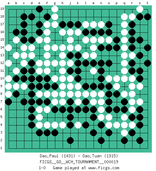 Last move : 1-0 2019 August 14 6:49:25 [Event "FICGS__GO__WCH_TOURNAMENT__000019"] [Site "FICGS"] [Date "2019.07.01"] [Round "1"] [Black "Dao,Paul"] [White "Dao,Tuan"] [Result "1-0"] [Rating 1 "1431"] [Rating 2 "1315"] 1.d4 q16 2.r17 q17 3.r16 q15 4.r15 q14 5.r14 q13 6.q4 d16 7.c17 d17 8.c16 c14 9.c15 d14 10.d15 e15 11.e14 f15 12.e13 c12 13.d18 e18 14.c18 f17 15.d12 b13 16.c11 b11 17.b14 c13 18.c10 b15 19.b16 a14 20.b10 a12 21.j17 l17 22.l16 k16 23.k17 l15 24.m16 m17 25.k15 j16 26.e16 h16 27.e17 f16 28.l14 m15 29.n16 n17 30.f3 g4 31.g6 f4 32.g3 e4 33.e3 e6 34.d5 f6 35.c7 h4 36.j2 k4 37.r12 q12 38.r11 p10 39.k10 k14 40.k13 j14 41.o3 r4 42.r5 q3 43.r3 p4 44.s4 q5 45.q6 r4 46.q2 q4 47.s2 r6 48.s5 r7 49.p6 o4 50.n4 o5 51.m5 n6 52.m6 n7 53.p8 q8 54.q9 p9 55.o8 r10 56.o9 o10 57.n10 p7 58.q7 r8 59.o7 m7 60.m9 k7 61.l7 l8 62.l6 m8 63.k6 k9 64.l9 j10 65.j11 j9 66.j7 k8 67.k11 g7 68.h8 g10 69.g9 h11 70.f10 j6 71.h6 h7 72.j5 j8 73.j6 g8 74.f9 h9 75.o6 n5 76.f7 f8 77.e7 e8 78.d7 f11 79.n2 m11 80.n11 m14 81.o12 q11 82.m12 r13 83.e10 f13 84.s13 r18 85.s18 q18 86.o14 o15 87.n14 n15 88.f18 g18 89.e19 g19 90.j13 h14 91.g12 f12 92.g11 h12 93.h10 m4 94.l4 g10 95.g13 h13 96.h10 n3 97.m3 g10 98.n4 g14 99.s10 s9 100.s11 s19 101.t18 e12 102.d11 d13 103.d8 m13 104.n12 l13 105.l12 j12 106.k12 a10 107.a9 b9 108.a11 n8 109.n9 a10 110.e9 h8 111.a11 s14 112.s15 a10 113.g11 h10 114.a11 t13 115.t14 a10 116.b8 a8 117.a7 c9 118.d9 e11 119.d10 a9 120.s6 s7 121.p14 j15 122.t12 g12 123.o16 f14 124.p15 q10 125.o17 r9 126.d6 e5 127.h17 g17 128.j4 1-0 Here are the names of the openings (joseki) played in the four corners : Corner q16 : q16 r17 Hoshi (Hwajeom, Seongjeom, Xingwei`) 4-4 Point. The star or hoshi (4-4) point, emphasizing influence at the potential expense of territory. Corner d16 : d16 c17 Hoshi (Hwajeom, Seongjeom, Xingwei`) 4-4 Point. The star or hoshi (4-4) point, emphasizing influence at the potential expense of territory. Player Black won this Go (weiqi, baduk) game. Follow this game move after move (download)The monkey jump is worth eight points. (Anonymous) When you stop learning you start dying. (Scott Adams)
