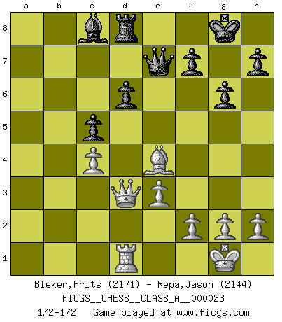 Last move : 1/2-1/2 2007 September 3 10:52:41 [Event "FICGS__CHESS__CLASS_A__000023"] [Site "FICGS"] [Date "2007.06.16"] [Round "1"] [White "Bleker,Frits"] [Black "Repa,Jason"] [Result "1/2-1/2"] [WhiteElo "2171"] [BlackElo "2144"] 1.Nf3 Nf6 2.c4 e6 3.Nc3 Bb4 4.Qc2 O-O 5.a3 Bxc3 6.Qxc3 b6 7.b4 a5 8.Bb2 axb4 9.axb4 Rxa1+ 10.Bxa1 c5 11.e3 d6 12.Be2 e5 13.d3 Re8 14.O-O Na6 15.bxc5 bxc5 16.Qa3 Nb4 17.Bc3 Nxd3 18.Bxd3 e4 19.Be2 exf3 20.Bxf3 Ne4 21.Rd1 Nxc3 22.Qxc3 Qe7 23.Qd3 Rd8 24.Be4 g6 1/2-1/2 Reti Opening Kingside Castling by player Black (move 4) Kingside Castling by player White (move 14) This chess game ended in a draw. Follow this game move after move (download)You know, comrade Pachman, I don't enjoy being a Minister, I would rather play Chess like you. (Che Guevara) Schach ist ein Teil der Kultur, und wenn es mit der Kultur abwärts geht, geht es auch mit dem Schach abwärts. (Mikhail Moiseyevich Botvinik) Me siento como si fuera una pieza en una partida de Ajedrez, cuando mi oponente me indica: esa pieza no puede ser movida. (Soren Kierkegaard) La solitude du joueur d'Echecs à l'approche du mat est semblable à celle du condamné. (Francis Szpiner) A government big enough to give you everything you want is strong enough to take everything you have. (Thomas Jefferson)