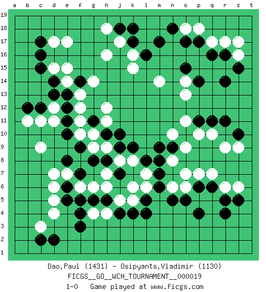 Last move : 1-0 2019 July 14 4:47:35 [Event "FICGS__GO__WCH_TOURNAMENT__000019"] [Site "FICGS"] [Date "2019.07.01"] [Round "1"] [Black "Dao,Paul"] [White "Osipyants,Vladimir"] [Result "1-0"] [Rating 1 "1431"] [Rating 2 "1130"] 1.q16 d4 2.r4 e17 3.f3 h4 4.f5 d6 5.k4 h6 6.f7 c9 7.h8 k5 8.l5 k6 9.j4 g4 10.f4 j5 11.l4 k8 12.m7 r6 13.p4 r9 14.r11 q10 15.q11 p10 16.p11 o7 17.o10 o9 18.n9 n8 19.m8 n10 20.m9 o11 21.k9 j8 22.j9 l6 23.m6 l7 24.j7 h7 25.g8 g6 26.g5 f6 27.e6 e7 28.e5 d5 29.e8 d7 30.d2 c3 31.c2 h9 32.h10 d12 33.c16 g9 34.f9 g10 35.l8 d15 36.c15 d17 37.d14 e15 38.c17 k16 39.m17 r17 40.r16 q17 41.p17 p18 42.o17 o18 43.n18 s16 44.s15 s17 45.r14 o13 46.p14 o14 47.o15 m14 48.g11 f10 49.e10 f11 50.e11 f12 51.e12 f13 52.e13 e14 53.d13 c11 54.c12 d11 55.b12 b11 56.f14 g14 57.h5 h11 58.j10 h12 59.k18 j17 60.j18 h18 61.k17 h16 62.l16 k15 63.s5 s6 64.s10 s9 65.p6 p7 66.q6 q7 67.r5 o6 68.o5 n6 69.n5 1-0 Here are the names of the openings (joseki) played in the four corners : Corner d4 : d4 f3 Hoshi (Hwajeom, Seongjeom, Xingwei`) 4-4 Point. The star or hoshi (4-4) point, emphasizing influence at the potential expense of territory. Ikken Kakari (Hankan Keolch'im, Yi Gua`jiao~, 1-Space Low Approach). Black 2 is the standard approach move to the 4-4. Player Black won this Go (weiqi, baduk) game. Follow this game move after move (download)Learn the eye-stealing tesuji. (Anonymous) All the troubles of the world come from being unable to sit alone in a quiet room. (Blaise Pascal)