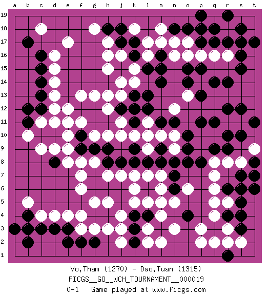 Last move : 0-1 2019 August 13 10:15:7 [Event "FICGS__GO__WCH_TOURNAMENT__000019"] [Site "FICGS"] [Date "2019.07.01"] [Round "1"] [Black "Vo,Tham"] [White "Dao,Tuan"] [Result "0-1"] [Rating 1 "1270"] [Rating 2 "1315"] 1.q3 q16 2.c16 d4 3.c3 c4 4.d3 e4 5.f2 r5 6.r4 q5 7.o4 e17 8.r17 d15 9.c15 d14 10.c13 r16 11.q17 o17 12.p17 p16 13.o18 s17 14.r9 n16 15.n18 r18 16.q18 q19 17.p18 q8 18.q9 p9 19.p8 q7 20.o8 p10 21.q11 o6 22.p11 n9 23.n8 n10 24.r14 p3 25.s15 p2 26.s16 m17 27.s5 q4 28.s3 q2 29.s7 m18 30.o15 o16 31.s18 d13 32.c12 d12 33.l8 n12 34.m14 o13 35.o14 p14 36.m15 q10 37.r10 r11 38.r12 s11 39.p15 s8 40.s10 r8 41.s12 r3 42.k17 l16 43.l13 l9 44.k16 k15 45.j15 k14 46.k8 j14 47.l15 h17 48.h18 g18 49.j18 h15 50.m16 c11 51.b11 b10 52.k9 k12 53.c10 d11 54.k13 j13 55.l12 k10 56.b12 c9 57.k11 l11 58.j12 j10 59.h8 c18 60.b17 f3 61.g2 b3 62.b2 k5 63.j5 j4 64.h4 h5 65.j6 h3 66.g4 k6 67.k4 j3 68.l4 g3 69.l6 m7 70.m8 j7 71.h6 h7 72.g6 k7 73.g7 l7 74.n7 m5 75.n6 m4 76.j8 h12 77.m3 l3 78.k3 l2 79.m9 l10 80.k2 m2 81.o10 g8 82.g9 f8 83.e3 f4 84.f9 e8 85.h11 j11 86.k12 h10 87.g11 g10 88.f10 f11 89.g12 h13 90.f12 e11 91.m11 m10 92.n11 f13 93.h9 g13 94.o9 e12 95.s4 s2 96.r1 r2 97.t8 t9 98.r6 q6 99.d8 e9 100.b4 b5 101.a3 l5 102.t6 t7 103.d10 d9 104.t11 e10 105.t17 n17 106.s17 g5 107.s6 m6 108.b3 l17 109.c14 j16 110.t8 n3 111.t7 f6 112.r19 f7 113.p19 j2 114.e2 d16 115.q14 k18 116.j17 h16 117.p13 n5 0-1 Here are the names of the openings (joseki) played in the four corners : Corner d4 : d4 c3 Hoshi (Hwajeom, Seongjeom, Xingwei`) 4-4 Point. The star or hoshi (4-4) point, emphasizing influence at the potential expense of territory. Corner q4 : q3 r5 Komoku (Somok, Xiao~mu`) 3-4 Point. The komoku (3-4) point is the traditional corner enclosure move.. Ikken Kakari (Hankan Keolch'im, Yi Gua`jiao~, 1-Space Low Pincer). The small knight move is the basic approach move to the 3-4 point stone. It has been continually used for over four centuries. There are limitless variations, with new moves constantly being discovered. White 2 opens the door to a treaure store of joseki. Corner d16 : c16 e17 Komoku (Somok, Xiao~mu`) 3-4 Point. The komoku (3-4) point is the traditional corner enclosure move.. Ikken Kakari (Hankan Keolch'im, Yi Gua`jiao~, 1-Space Low Pincer). The small knight move is the basic approach move to the 3-4 point stone. It has been continually used for over four centuries. There are limitless variations, with new moves constantly being discovered. White 2 opens the door to a treaure store of joseki. Corner q16 : q16 r17 Hoshi (Hwajeom, Seongjeom, Xingwei`) 4-4 Point. The star or hoshi (4-4) point, emphasizing influence at the potential expense of territory. Player White won this Go (weiqi, baduk) game. Follow this game move after move (download)Extend one hand from the cutting points. (Anonymous) That's absurd. I love it. (Gregory House, House M.D.)