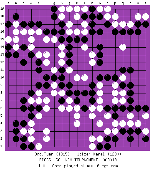 Last move : 1-0 2019 August 21 14:13:19 [Event "FICGS__GO__WCH_TOURNAMENT__000019"] [Site "FICGS"] [Date "2019.07.01"] [Round "1"] [Black "Dao,Tuan"] [White "Walzer,Karel"] [Result "1-0"] [Rating 1 "1315"] [Rating 2 "1200"] 1.q16 d4 2.d17 q4 3.c6 f3 4.c12 d15 5.f16 c13 6.d13 d14 7.b13 e13 8.c14 f15 9.g16 c16 10.c17 e16 11.e17 g15 12.h15 h14 13.j15 l16 14.j14 h13 15.e12 f13 16.j13 h12 17.n16 j17 18.h17 l14 19.j12 q14 20.n14 m13 21.n13 m12 22.n12 l10 23.q11 q10 24.r11 r17 25.r16 q17 26.p16 o18 27.n18 p18 28.s17 s18 29.s16 t18 30.b4 c3 31.d8 k4 32.r6 r5 33.q6 n4 34.o10 p8 35.r8 n8 36.m9 k10 37.m8 n7 38.k8 j11 39.h11 g11 40.h10 m18 41.m17 l17 42.l18 k18 43.m19 h18 44.g18 j16 45.h16 j19 46.k15 k16 47.l15 k19 48.j9 d16 49.r3 r4 50.q3 p3 51.p2 o3 52.o2 n2 53.s3 s4 54.r2 f7 55.f9 f12 56.e11 j7 57.k7 k6 58.l6 k5 59.e6 f6 60.b3 e5 61.c2 d2 62.c4 d3 63.b2 m5 64.d1 e1 65.c1 f2 66.n1 m1 67.o1 m2 68.h7 h6 69.j8 j6 70.d5 e7 71.d6 h8 72.h9 g8 73.f10 d7 74.c7 b17 75.b18 b15 76.a17 b16 77.q9 p9 78.p10 m6 79.p5 p4 80.s6 n9 81.n10 q8 82.r9 o5 83.o6 l7 84.m7 n6 85.g19 h19 86.m16 o19 87.o17 p17 88.t17 p7 89.p6 n19 90.l8 e8 91.e9 b14 92.a14 l19 93.m18 q7 94.r7 t5 95.t6 g9 96.g10 a15 97.a13 t3 98.t2 1-0 Here are the names of the openings (joseki) played in the four corners : Corner d4 : d4 c6 Hoshi (Hwajeom, Seongjeom, Xingwei`) 4-4 Point. The star or hoshi (4-4) point, emphasizing influence at the potential expense of territory. Ikken Kakari (Hankan Keolch'im, Yi Gua`jiao~, 1-Space Low Approach). Black 2 is the standard approach move to the 4-4. Corner q16 : q16 l16 Hoshi (Hwajeom, Seongjeom, Xingwei`) 4-4 Point. The star or hoshi (4-4) point, emphasizing influence at the potential expense of territory. Corner q4 : q4 r6 Hoshi (Hwajeom, Seongjeom, Xingwei`) 4-4 Point. The star or hoshi (4-4) point, emphasizing influence at the potential expense of territory. Ikken Kakari (Hankan Keolch'im, Yi Gua`jiao~, 1-Space Low Approach). Black 2 is the standard approach move to the 4-4. Player Black won this Go (weiqi, baduk) game. Follow this game move after move (download)The poor player plays the opponent's game for him. (Anonymous) It is not true that people stop pursuing dreams because they grow old, they grow old because they stop pursuing dreams. (Gabriel Garcia Marquez)