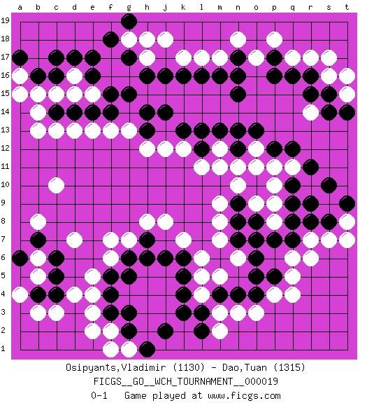 Last move : 0-1 2019 July 16 23:14:18 [Event "FICGS__GO__WCH_TOURNAMENT__000019"] [Site "FICGS"] [Date "2019.07.01"] [Round "1"] [Black "Osipyants,Vladimir"] [White "Dao,Tuan"] [Result "0-1"] [Rating 1 "1130"] [Rating 2 "1315"] 1.q16 d4 2.c16 q4 3.e17 c10 4.k4 m3 5.g3 e3 6.g5 d7 7.k16 r14 8.q12 r17 9.r16 q17 10.p16 s16 11.s15 s17 12.r15 o17 13.n15 r6 14.r9 c13 15.o4 m5 16.o6 m7 17.o8 o3 18.n4 n3 19.m4 l4 20.l3 l5 21.k3 p4 22.o5 m9 23.q7 r7 24.r8 q6 25.p7 g7 26.j6 j8 27.l2 m2 28.k5 k7 29.h6 f2 30.g2 m11 31.g15 g13 32.j14 j12 33.n13 o11 34.p12 p10 35.q10 t15 36.t14 t16 37.s14 m17 38.m16 l17 39.l16 j18 40.g17 b15 41.b16 c15 42.f14 f13 43.e14 e13 44.k13 k12 45.l13 a16 46.a17 a15 47.c17 d15 48.e16 g18 49.f18 h17 50.h16 s7 51.s8 p9 52.q9 f6 53.f5 e5 54.h7 h8 55.p17 p18 56.n17 n18 57.n16 o12 58.o13 o9 59.n8 m8 60.n9 n10 61.l12 l11 62.d14 d13 63.c14 b14 64.g6 f7 65.f3 e2 66.h13 h12 67.h14 p11 68.n7 q11 69.r11 p8 70.q8 n6 71.o7 g1 72.h1 f1 73.j2 e15 74.f15 t8 75.t9 t7 76.s10 k17 77.n12 n11 78.f4 e4 79.p5 q5 80.g19 h18 81.j16 m12 82.m13 d16 83.d17 b13 84.k6 l6 85.b4 c3 86.b7 b6 87.c6 b5 88.c5 b3 89.c4 a4 90.a6 b8 0-1 Here are the names of the openings (joseki) played in the four corners : Corner d4 : d4 g3 Hoshi (Hwajeom, Seongjeom, Xingwei`) 4-4 Point. The star or hoshi (4-4) point, emphasizing influence at the potential expense of territory. Niken Kakari (Dukan Keolch'im, E`r Gua`jiao~, 2-Space Low Approach). White typically answers by 7-3 or 3-5 (which is not joseki). Corner q16 : q16 r14 Hoshi (Hwajeom, Seongjeom, Xingwei`) 4-4 Point. The star or hoshi (4-4) point, emphasizing influence at the potential expense of territory. Ikken Kakari (Hankan Keolch'im, Yi Gua`jiao~, 1-Space Low Approach). White 2 is the standard approach move to the 4-4. Player White won this Go (weiqi, baduk) game. Follow this game move after move (download)... {it is} something unearthly... if there are sentient beings on other planets, then they play go. (Emanuel Lasker, chess world champion) Always two there are. No more no less. A master, and an apprentice. (Master Yoda in Star Wars ep.1)