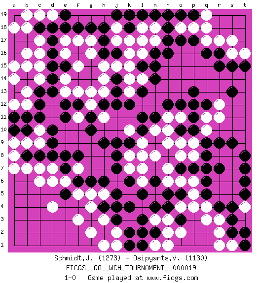 Last move : 1-0 2019 November 5 18:26:16 [Event "FICGS__GO__WCH_TOURNAMENT__000019"] [Site "FICGS"] [Date "2019.07.01"] [Round "1"] [Black "Schmidt,Jonny"] [White "Osipyants,Vladimir"] [Result "1-0"] [Rating 1 "1273"] [Rating 2 "1130"] 1.d16 d4 2.q16 q3 3.q5 o4 4.r9 k16 5.j3 f3 6.c8 c6 7.h9 l4 8.h12 g16 9.n16 r17 10.c11 c17 11.d17 c16 12.d15 c15 13.d14 b13 14.r16 q17 15.p17 p18 16.o17 s16 17.s15 s17 18.r15 o18 19.n18 n7 20.c13 b12 21.c18 b18 22.e18 m17 23.n17 m18 24.m16 l16 25.m19 l18 26.l3 m3 27.h17 g17 28.g18 j17 29.h16 h15 30.h18 j15 31.m14 q7 32.j13 g13 33.e7 p9 34.j5 p12 35.p11 o11 36.o12 q11 37.p10 q10 38.o10 n11 39.q12 r12 40.p13 r11 41.q9 p8 42.r7 r6 43.q6 r8 44.q8 s7 45.p7 o8 46.r7 s8 47.q7 r5 48.s9 n10 49.r4 q4 50.s3 s5 51.t6 r3 52.s4 s6 53.s2 r2 54.b14 c14 55.c12 g12 56.g11 f11 57.f12 h11 58.g10 h13 59.j12 f13 60.e12 e13 61.k18 k14 62.m4 m5 63.n4 n3 64.n5 n6 65.o5 l6 66.k4 p5 67.l5 o6 68.m6 p6 69.o3 p4 70.l13 k13 71.k12 o2 72.b17 b16 73.a17 a18 74.a16 a15 75.d13 f17 76.f18 f15 77.t5 l7 78.n12 k10 79.m2 n2 80.h2 g2 81.k6 k7 82.j7 d7 83.d8 e6 84.f6 f7 85.e8 f5 86.g6 g5 87.e5 d6 88.h6 h3 89.g3 g4 90.b11 a14 91.j14 h14 92.m11 m10 93.l11 o9 94.p12 e16 95.t7 s1 96.l10 l9 97.k9 l8 98.m9 n9 99.k2 h1 100.t15 t16 101.s13 j2 102.l19 l17 103.j8 b7 104.e11 b9 105.b8 a8 106.f8 l14 107.l15 k15 108.m15 c9 109.d9 c10 110.d10 c7 111.t2 m1 112.l2 j18 113.j19 c19 114.d18 d19 115.e19 b19 116.b10 a9 117.a10 a7 118.h4 h5 119.j4 k8 120.j9 e14 121.e15 e17 122.l1 n1 123.o7 m8 124.t1 r1 125.o19 q18 126.p19 q19 127.n19 a12 128.a11 b15 129.k1 j1 130.j16 k17 131.k19 t4 132.t8 1-0 Here are the names of the openings (joseki) played in the four corners : Corner q4 : q3 q5 Komoku (Somok, Xiao~mu`) 3-4 Point. The komoku (3-4) point is the traditional corner enclosure move.. Ikken Takagakari (Hankan Nop'dakeolch'im, Yi Gaogua`jiao~, 1-Space High Approach). The 5-4 approach move has become more popular in modern times, as modern Go emphasizes speed and influence. Corner d4 : d4 j3 Hoshi (Hwajeom, Seongjeom, Xingwei`) 4-4 Point. The star or hoshi (4-4) point, emphasizing influence at the potential expense of territory. Player Black won this Go (weiqi, baduk) game. Follow this game move after move (download)Don't make empty triangles. (Anonymous) All men can see these tactics whereby I conquer, but what none can see is the strategy out of which victory is evolved. (Sun Tzu)