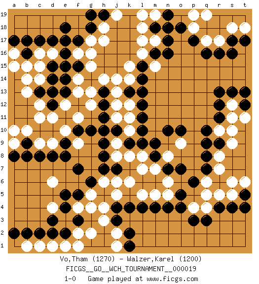 Last move : 1-0 2019 August 29 10:33:32 [Event "FICGS__GO__WCH_TOURNAMENT__000019"] [Site "FICGS"] [Date "2019.07.01"] [Round "1"] [Black "Vo,Tham"] [White "Walzer,Karel"] [Result "1-0"] [Rating 1 "1270"] [Rating 2 "1200"] 1.q16 d4 2.r4 d16 3.f3 h3 4.p3 q4 5.q3 p4 6.o4 q6 7.p6 q5 8.q7 r7 9.q8 r8 10.q9 s10 11.r11 s11 12.r12 s12 13.r13 s5 14.s4 r5 15.f5 d6 16.j4 d11 17.j3 h6 18.f7 g5 19.g6 h4 20.h7 j6 21.j7 k6 22.l4 l7 23.l9 f4 24.e4 g4 25.e5 n6 26.o5 n8 27.n10 k8 28.j10 j9 29.h9 k10 30.k9 j8 31.h8 l8 32.m9 g2 33.d3 j2 34.k2 f2 35.e2 j1 36.d8 m5 37.m4 l5 38.f17 h17 39.c17 c16 40.d17 f16 41.e16 e15 42.e17 g16 43.d15 c15 44.d14 c14 45.e14 d13 46.f15 l17 47.n17 m15 48.m16 l16 49.l15 m17 50.n16 k15 51.l14 k14 52.l13 j11 53.h10 k12 54.l12 c9 55.c8 d9 56.b9 b10 57.b8 g13 58.e13 e12 59.c13 b13 60.d12 c12 61.d13 c11 62.b16 b14 63.t5 t6 64.t4 s6 65.o7 r17 66.r16 q17 67.p17 p18 68.o18 q19 69.s17 s18 70.s16 t18 71.s13 g15 72.k13 j13 73.h12 j12 74.l11 g12 75.h11 k11 76.h13 h14 77.g18 h18 78.m18 l18 79.k1 f1 80.e9 e10 81.f10 f9 82.e8 f11 83.g10 r10 84.q10 o9 85.o10 n5 86.n4 m19 87.n18 p19 88.n7 m7 89.m8 a15 90.b17 a16 91.a17 b15 92.h19 j19 93.g19 g17 94.e18 f14 95.e15 f13 96.r9 s9 97.t12 t11 98.t13 e1 99.c2 d1 100.d2 c1 101.b2 b1 102.a2 j5 103.k4 a9 104.a8 a10 105.l10 j14 106.n19 l19 107.t17 1-0 Here are the names of the openings (joseki) played in the four corners : Corner d4 : d4 f3 Hoshi (Hwajeom, Seongjeom, Xingwei`) 4-4 Point. The star or hoshi (4-4) point, emphasizing influence at the potential expense of territory. Ikken Kakari (Hankan Keolch'im, Yi Gua`jiao~, 1-Space Low Approach). Black 2 is the standard approach move to the 4-4. Player Black won this Go (weiqi, baduk) game. Follow this game move after move (download)Connect with good shape. (Anonymous) Hello Thibault, if I have had a plan (and I had one, I hope), I have forgotten it during the last week... - Hello Heinz-Georg. What do you mean a plan ? (Anonymous players, during a Big Chess game)