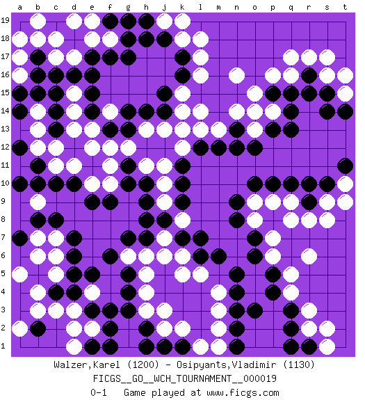 Last move : 0-1 2019 August 10 18:58:37 [Event "FICGS__GO__WCH_TOURNAMENT__000019"] [Site "FICGS"] [Date "2019.07.01"] [Round "1"] [Black "Walzer,Karel"] [White "Osipyants,Vladimir"] [Result "0-1"] [Rating 1 "1200"] [Rating 2 "1130"] 1.d4 q4 2.d16 q17 3.q15 n16 4.r16 r6 5.o3 m4 6.q3 r3 7.n4 m3 8.q2 r2 9.p4 q5 10.n5 j3 11.g3 h4 12.g4 h5 13.p5 p6 14.q10 q8 15.o6 p7 16.k16 l17 17.d10 c17 18.c16 d17 19.e17 e18 20.f17 f18 21.g17 d13 22.e14 e13 23.g14 c11 24.c10 d11 25.k10 f11 26.f9 c3 27.c4 d3 28.e3 e2 29.f2 e4 30.f3 b4 31.b5 b3 32.e5 d2 33.b2 a2 34.h2 j2 35.g5 h6 36.n9 n14 37.q13 r17 38.r9 r8 39.n12 o13 40.o12 l14 41.k17 l16 42.g11 b14 43.b17 b18 44.b15 a18 45.c14 b13 46.c13 c12 47.b11 b12 48.a10 d14 49.c15 f14 50.e15 g12 51.f13 f12 52.g13 h11 53.g10 h13 54.h14 j13 55.j14 k13 56.k7 k5 57.l6 k6 58.g7 g6 59.f6 c5 60.d5 b9 61.b10 c6 62.b8 b7 63.c8 c7 64.d7 a5 65.d6 p16 66.p15 o15 67.p13 s16 68.s15 q16 69.r15 s17 70.h7 l5 71.m6 j7 72.j8 j6 73.h10 j11 74.k11 k12 75.n13 o14 76.l12 o9 77.o10 p9 78.p10 k8 79.l7 j9 80.h8 j10 81.k9 t15 82.t14 t16 83.s14 k18 84.j18 l18 85.n2 m2 86.k1 l1 87.j1 k2 88.h1 h3 89.e1 d1 90.f1 s9 91.s10 q9 92.r10 s8 93.o7 o8 94.n8 j19 95.h18 k15 96.j15 k14 97.a7 b6 98.r1 s1 99.q1 s2 100.n1 m1 101.n3 a17 102.b16 e10 103.e9 f10 104.h9 m13 105.m12 l13 106.h19 k19 107.c19 c18 108.f19 d19 109.g19 e19 110.a14 a16 111.a15 d15 112.e16 p14 113.q14 t10 114.t11 t9 115.g18 b19 116.a12 e12 0-1 Here are the names of the openings (joseki) played in the four corners : Corner q16 : q17 q15 Komoku (Somok, Xiao~mu`) 3-4 Point. The komoku (3-4) point is the traditional corner enclosure move.. Ikken Takagakari (Hankan Nop'dakeolch'im, Yi Gaogua`jiao~, 1-Space High Approach). The 5-4 approach move has become more popular in modern times, as modern Go emphasizes speed and influence. Corner d4 : d4 j3 Hoshi (Hwajeom, Seongjeom, Xingwei`) 4-4 Point. The star or hoshi (4-4) point, emphasizing influence at the potential expense of territory. Corner d16 : d16 c17 Hoshi (Hwajeom, Seongjeom, Xingwei`) 4-4 Point. The star or hoshi (4-4) point, emphasizing influence at the potential expense of territory. Player White won this Go (weiqi, baduk) game. Follow this game move after move (download)Territory really exists only in the end. (Pierre Audouard) It is not enough to be a good player... you must also play well. (Siegbert Tarrasch)