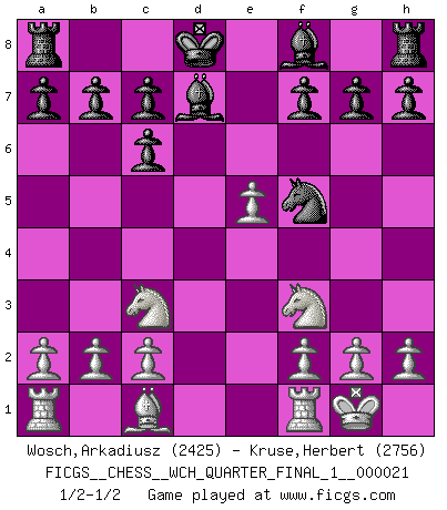Last move : 1/2-1/2 2019 July 12 22:25:22 [Event "FICGS__CHESS__WCH_QUARTER_FINAL_1__000021"] [Site "FICGS"] [Date "2019.07.01"] [Round "4"] [White "Wosch,Arkadiusz"] [Black "Kruse,Herbert"] [Result "1/2-1/2"] [WhiteElo "2425"] [BlackElo "2756"] 1.e4 e5 2.Nf3 Nc6 3.Bb5 Nf6 4.O-O Nxe4 5.d4 Nd6 6.Bxc6 dxc6 7.dxe5 Nf5 8.Qxd8+ Kxd8 9.Nc3 Bd7 1/2-1/2 Ruy Lopez : Berlin defense, Open variation Kingside Castling by player White (move 4) This chess game ended in a draw. Follow this game move after move (download)Chess is above all, a fight ! (Emanuel Lasker) Schachspieler können ausgezeichnet Varianten am Schachbrett berechnen, aber nicht im realen Leben. Zu stark ist der Individualismus im Schach ausgeprägt, und für viele ist ein kleiner momentaner persönlicher Vorteil wichtiger als ein weit größerer Vorteil von morgen. (Anatoly Karpov) Buenas posiciones no logran ganar juegos, buenas movidas sí. (Gerald Abrahams) Seul un grand joueur sait à quel point il joue faiblement. (Xavier Tartacover) Before all elsed, be armed. (Niccolo Machiavelli)