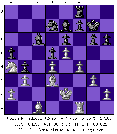 Last move : 1/2-1/2 2019 October 22 7:24:27 [Event "FICGS__CHESS__WCH_QUARTER_FINAL_1__000021"] [Site "FICGS"] [Date "2019.07.01"] [Round "6"] [White "Wosch,Arkadiusz"] [Black "Kruse,Herbert"] [Result "1/2-1/2"] [WhiteElo "2425"] [BlackElo "2756"] 1.d4 d5 2.Nf3 Nf6 3.c4 c6 4.e3 e6 5.Nc3 Nbd7 6.Qc2 Be7 7.b3 h6 8.Bb2 b6 9.Rd1 Bb7 10.Be2 O-O 11.O-O Qc7 12.Ne5 a6 13.Nxd7 Nxd7 14.e4 Rad8 15.cxd5 cxd5 16.Qc1 Kh8 17.e5 b5 18.Bd3 b4 19.Na4 Qxc1 20.Rxc1 Rc8 21.g3 g6 22.f4 Kg7 23.Kf2 Rxc1 24.Bxc1 a5 25.Ke2 Bc6 1/2-1/2 Queen's pawn game Kingside Castling by player Black (move 10) Kingside Castling by player White (move 11) This chess game ended in a draw. Follow this game move after move (download)It began to feel as though you were playing against Chess itself. - On playing against Robert Fischer. (Walter Shipman) Capablanka war das größte Genie der Schachgeschichte! Aber denken sie nicht er habe nichts vom Schach verstanden. Er wusste nur soviel wie er wissen musste um seine Ziele zu erreichen. (Mikhail Moiseyevich Botvinik) Del Ajedrez se ha dicho que la vida no es lo suficientemente larga para él, pero eso es culpa de la vida, no del Ajedrez. (William Ewart Napier) Le système Elo représente seulement une moyenne. Il est simplement un indicateur de votre stabilité. (Anatoli Karpov) Life is the sum of all your choices. (Albert Camus)