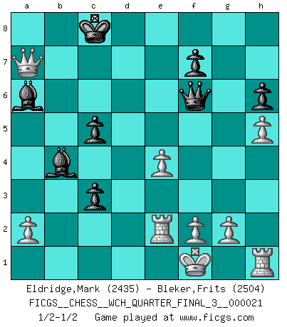Last move : 1/2-1/2 2019 August 29 19:14:35 [Event "FICGS__CHESS__WCH_QUARTER_FINAL_3__000021"] [Site "FICGS"] [Date "2019.07.01"] [Round "2"] [White "Eldridge,Mark"] [Black "Bleker,Frits"] [Result "1/2-1/2"] [WhiteElo "2435"] [BlackElo "2504"] 1.Nf3 Nf6 2.c4 c6 3.d4 d5 4.Nc3 e6 5.Bg5 h6 6.Bh4 dxc4 7.e4 g5 8.Bg3 b5 9.Be2 Bb7 10.h4 g4 11.Ne5 Nbd7 12.Nxd7 Qxd7 13.Bxg4 b4 14.Be5 bxc3 15.Bxf6 cxb2 16.Rb1 Bb4+ 17.Kf1 Rg8 18.Rxb2 c5 19.d5 Rg6 20.Qf3 c3 21.dxe6 Qb5+ 22.Re2 Ba6 23.Qf4 Qc6 24.h5 Rxg4 25.Qxg4 Qxe6 26.Qg8+ Kd7 27.Qxa8 Qxf6 28.Qxa7+ Kc8 29.Qa8+ Kd7 30.Qa7+ Kc8 1/2-1/2 Reti Opening This chess game ended in a draw. Follow this game move after move (download)I give 98 percent of my mental energy to Chess. Others give only 2 percent. (Bobby Fischer) Wie bekannt hörte Morphy 1859 auf, Schach zu spielen. Seine Enttäuschung galt nicht so sehr dem Schach, wie den Schachspielern. (Robert James Fischer) La pasion por jugar al Ajedrez es una de las mas inexplicables en el mundo. (H.G. Wells) Mais n'est-ce pas déjà le limiter injurieusement que d'appeler les échecs un jeu? N'est-ce pas aussi une science, un art, ou quelque chose qui, comme le cercueil de Mahomet entre ciel et terre, est suspendu entre l'un et l'autre, et qui réunit un nombre incroyable de contraires ? (Stefan Zweig) I have opinions of my own - strong opinions - but I don't always agree with them. (George Bush)